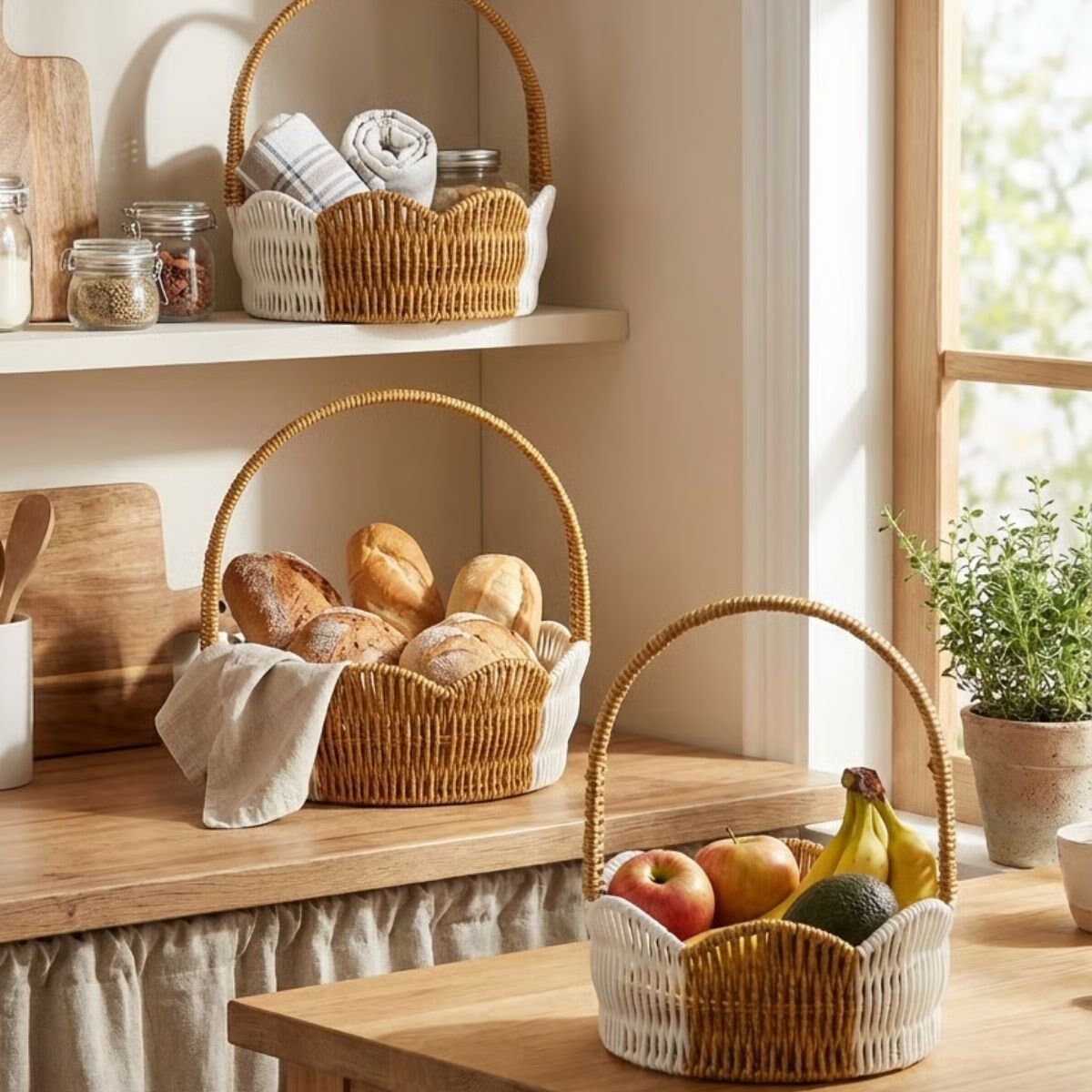 Dayanıklı plastik rattan malzemeden üretilen sepetler; hafif, sağlam ve uzun ömürlüdür. Saplı yapısı sayesinde kolay taşınabilir, iç içe geçebilen tasarımı ile kullanılmadığında minimum alan kaplayarak yer tasarrufu sağlar. Mutfakta meyve, ekmek ve kahvaltılık sunumlarında; banyoda kozmetik ve kişisel bakım ürünleri için; salon ve masaüstlerinde ise çok amaçlı organizer olarak rahatlıkla kullanılabilir.