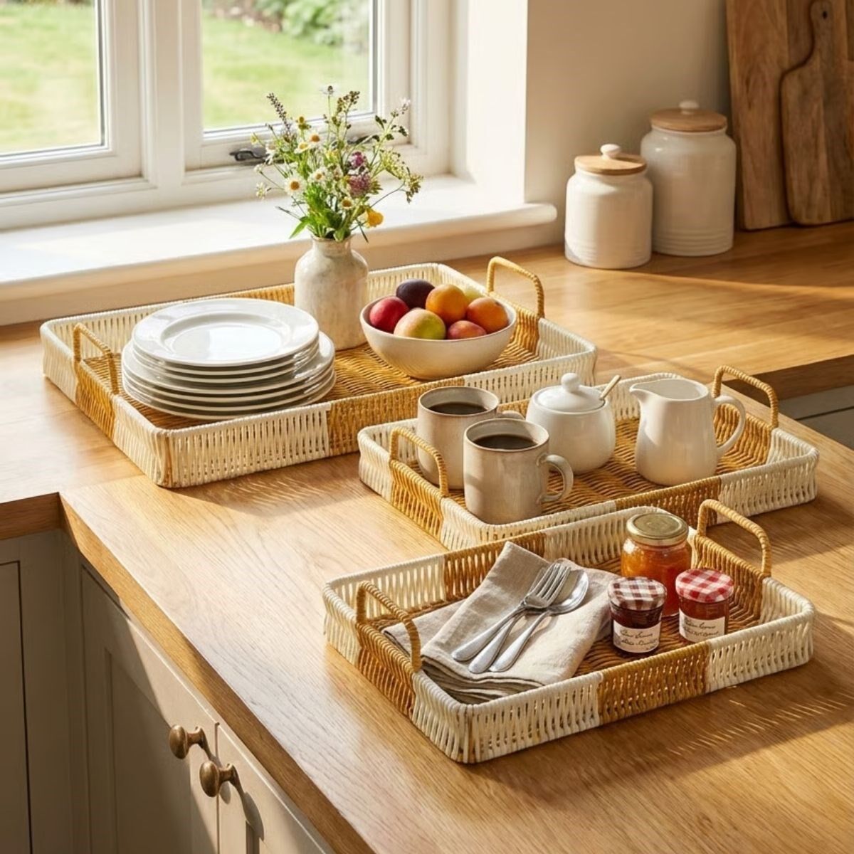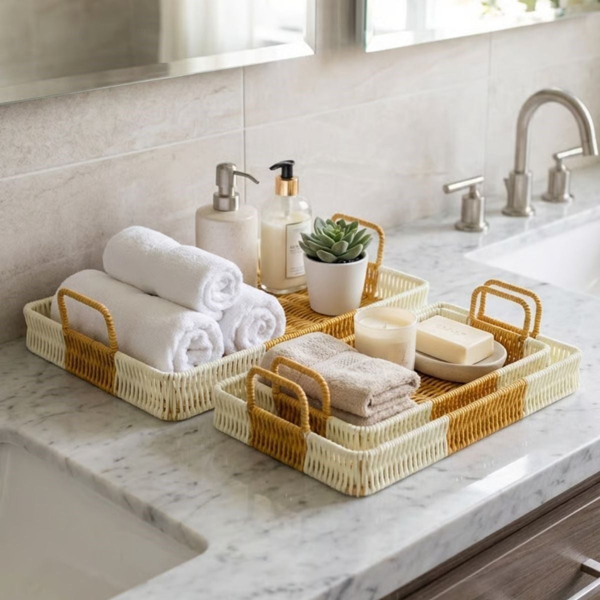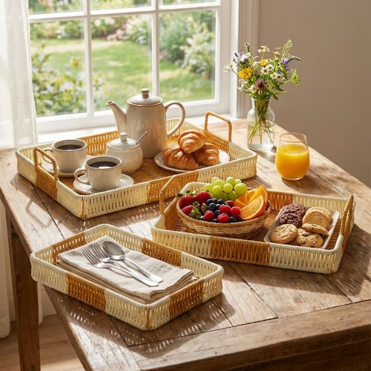 AD İç İçe Geçebilen 3’lü Dikdörtgen Plastik Rattan Tepsi Seti–Çift Renkli Hasır Görünümlü Çok Amaçlı Servis ve Sunum Tepsileri