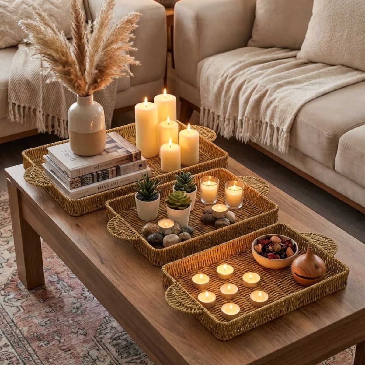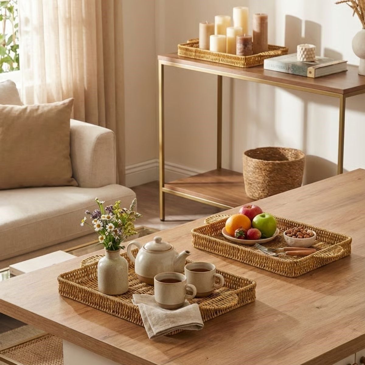 Dayanıklı plastik rattan malzemeden üretilen bu tepsi seti; kahvaltı, çay, kahve, ikram ve atıştırmalık sunumları için idealdir. Hafif ama sağlam yapısı sayesinde günlük kullanıma uygundur. Aynı zamanda salon, balkon ve masaüstlerinde dekoratif sunum tepsisi veya organizer olarak da tercih edilebilir.