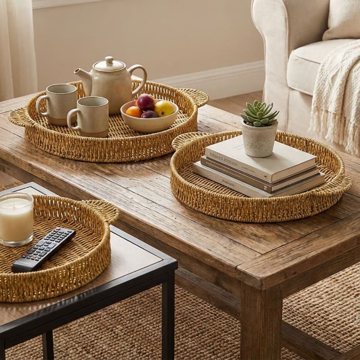 AD İç İçe Geçebilen 3’lü Yuvarlak Plastik Rattan Tepsi Seti–Hasır Görünümlü Çok Amaçlı Servis ve Sunum Tepsileri