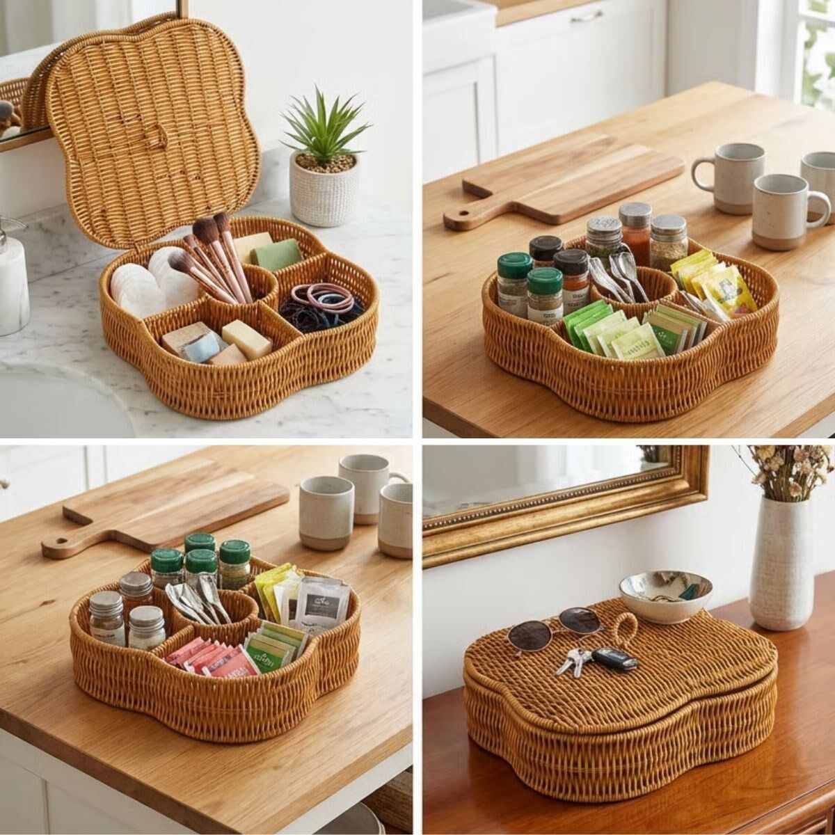 Mutfakta çay, kahve ve küçük aksesuarları düzenlemekten; banyoda kozmetik ve bakım ürünlerini saklamaya, ofiste kırtasiye malzemelerini toparlamaktan masaüstü sunumlara kadar geniş bir kullanım alanı sunar. Hasır desenli rattan görünümü sayesinde dekoratif bir aksesuar olarak da bulunduğu ortama uyum sağlar.