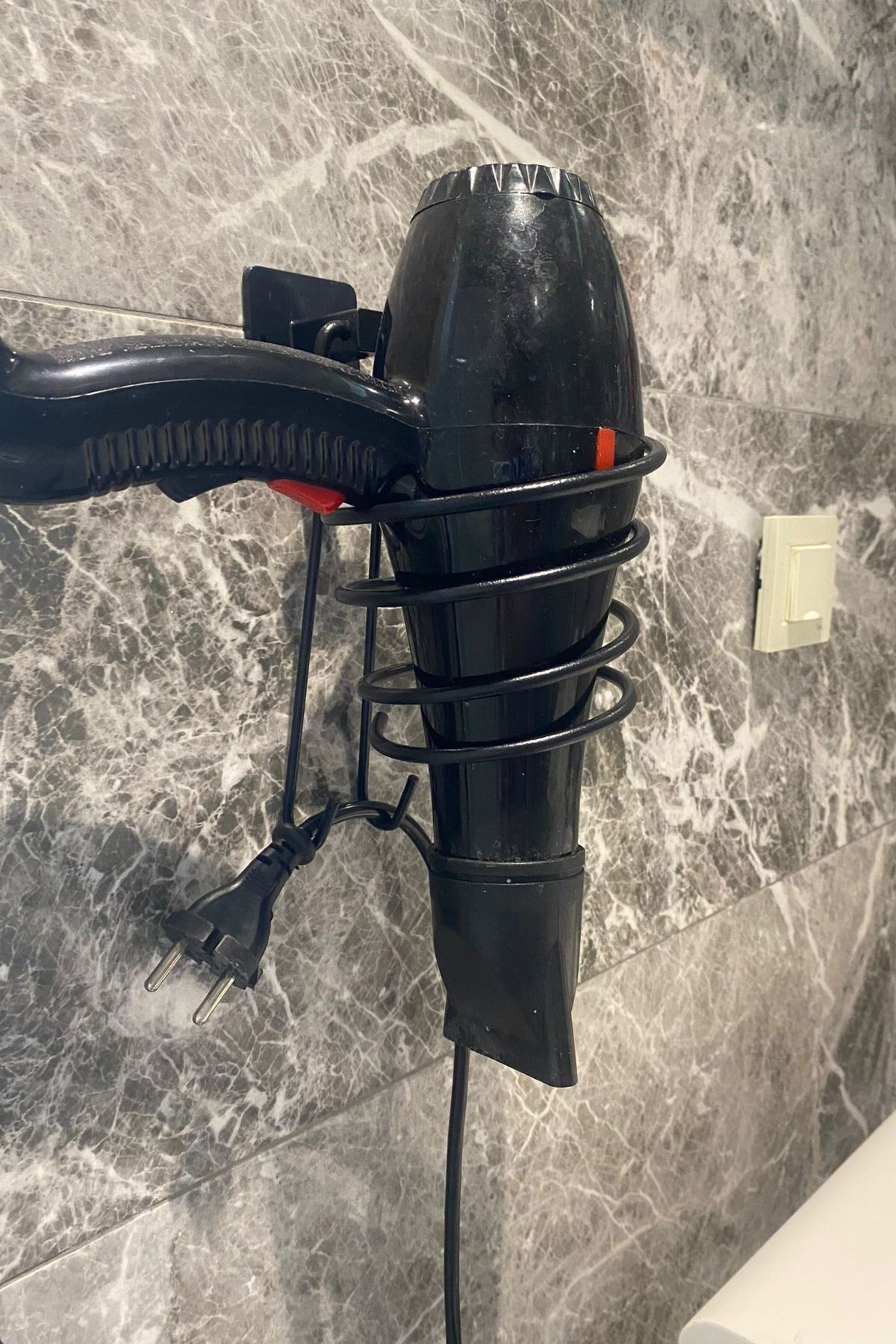 Kendiliğinden yapışkanlı siyah paslanmaz metal fön makinesi askısı, elektrikli cihazlarınızı düzenli bir şekilde saklamanıza ve kullanımınızı kolaylaştırmaya yardımcı olan pratik bir üründür. Şık tasarımıyla da banyo veya mutfak dekorunuza modern bir dokunuş katmaktadır.