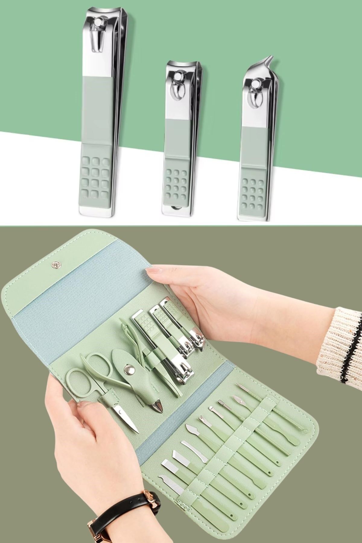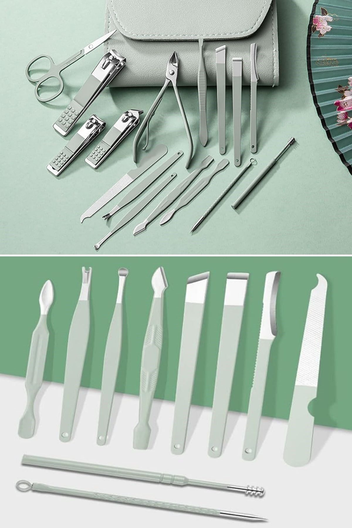 16 farklı parça ile kapsamlı bakım: Tırnak makası, törpü, cımbız, makas, tırnak temizleme aparatı ve daha fazlası
