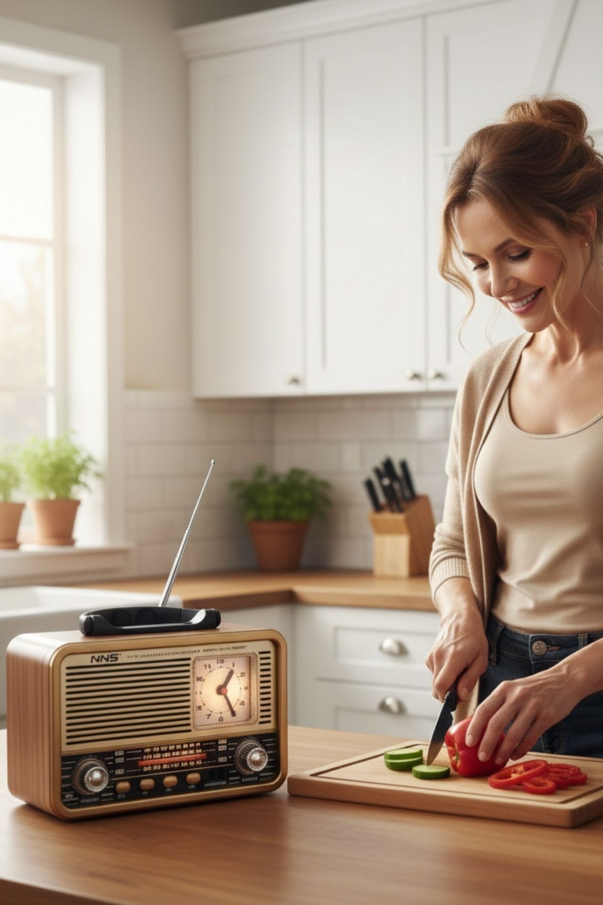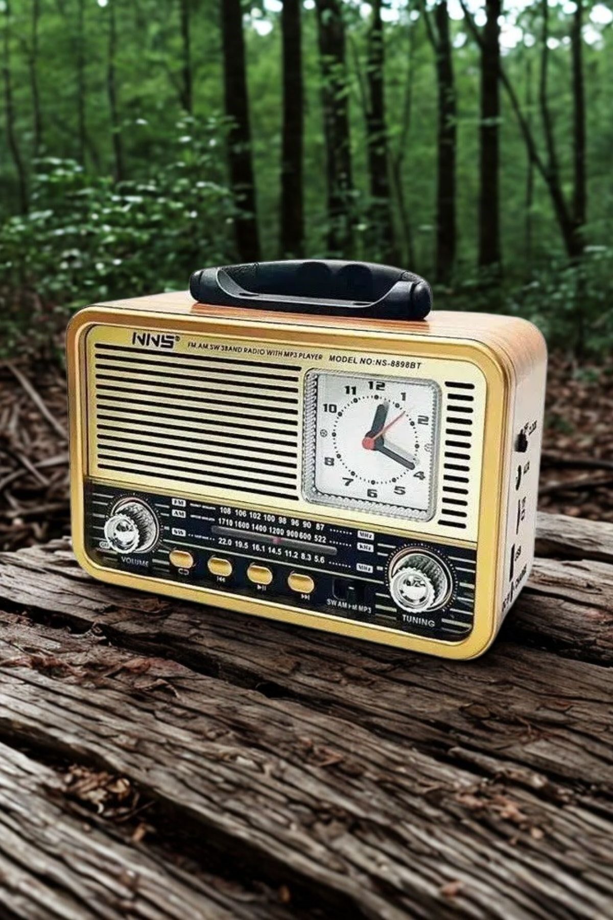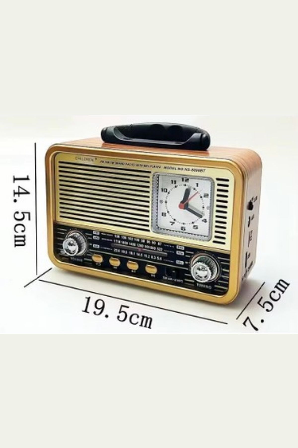 AD Orta Boy Saat Göstergeli Retro Ahşap Tasarım Bluetooth Hoparlörlü Radyo – FM/AM Destekli, Şarjlı ve Taşınabilir Radyo NS-8898