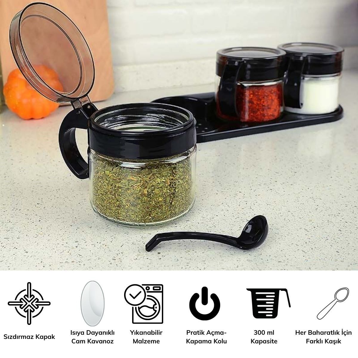 - AD Siyah 3'lü Standlı Kaşıklı Cam Baharatlık Takımında bulunan her bir baharatlık 300 ml kapasiteden oluşmaktadır