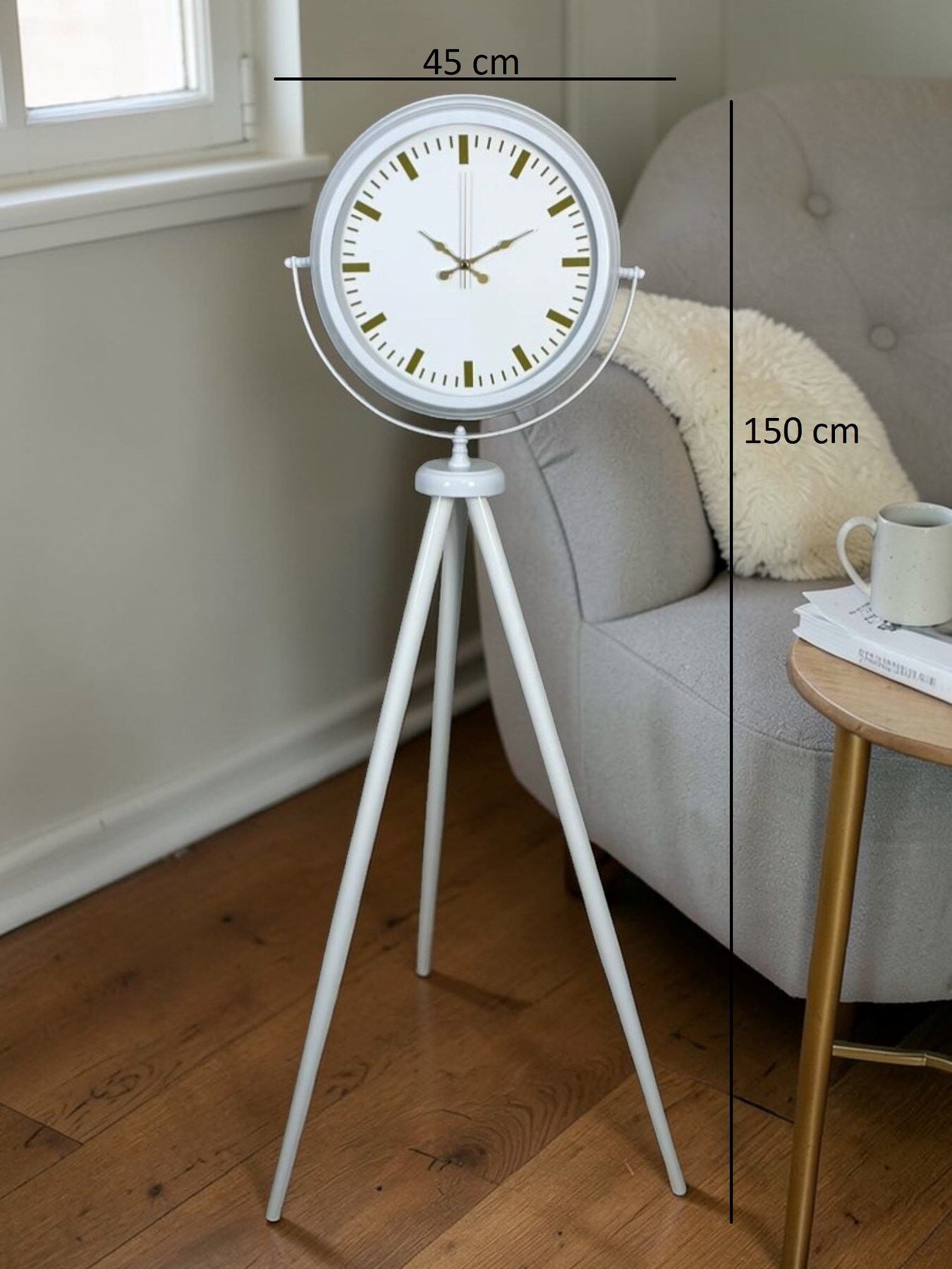 Modern tasarımın zarif sadelikle buluştuğu bu 150 x 45 cm beyaz ayaklı saat, bulunduğu ortama ferahlık ve şıklık katar. Minimal çizgileri ve gold detaylı indeks yapısı sayesinde hem klasik hem modern dekorasyonlarla mükemmel uyum sağlar.