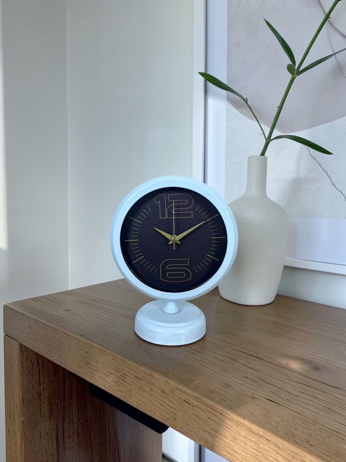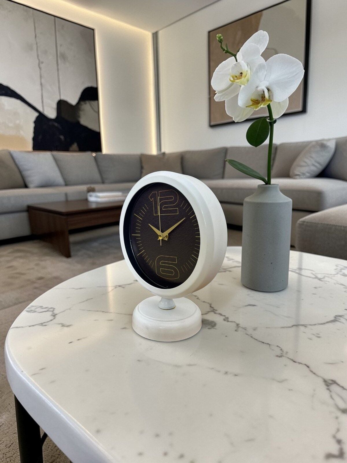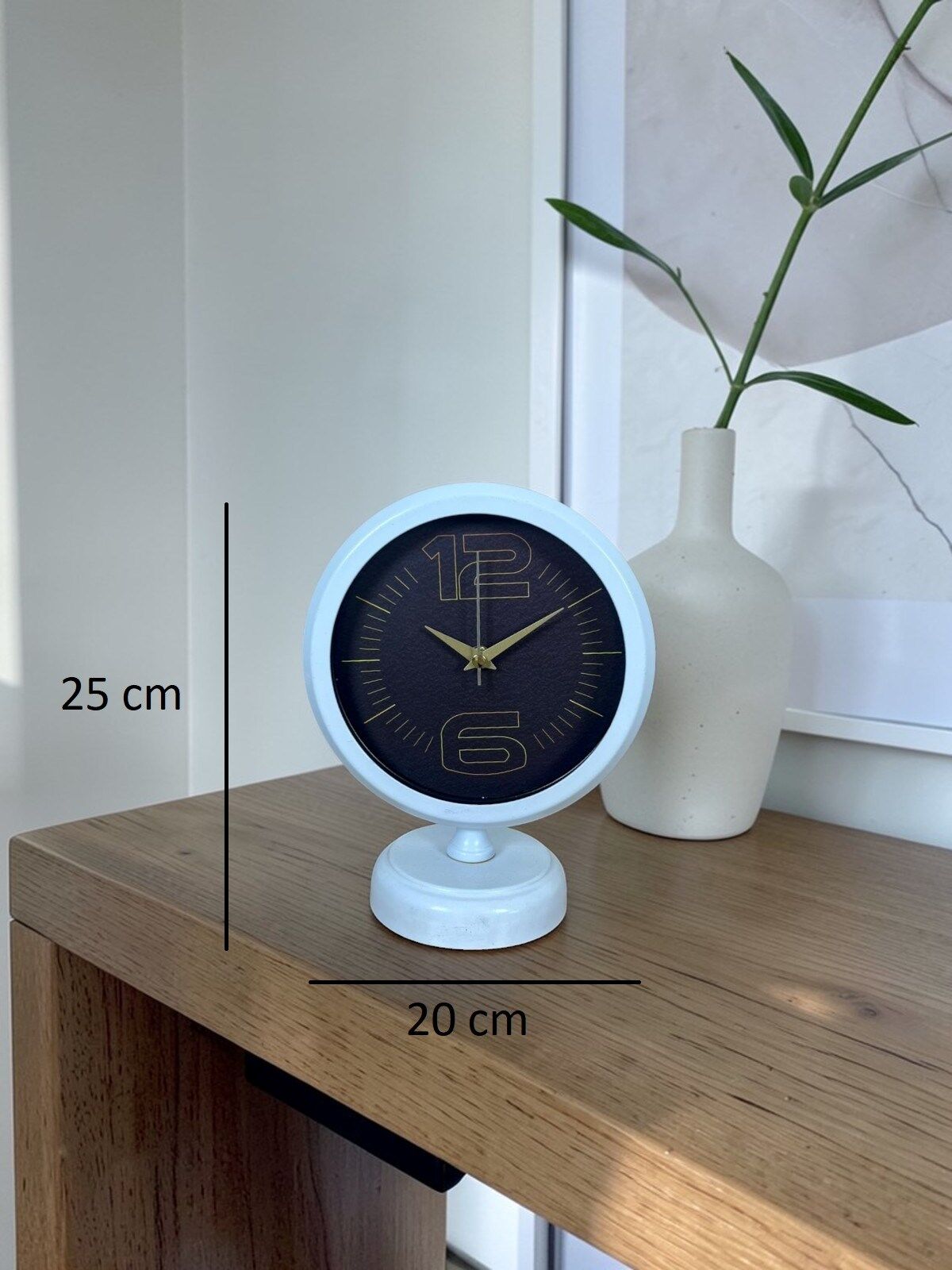 25 x 20 cm ölçülerindeki beyaz masa saati, modern ve sade tasarımıyla yaşam alanlarınıza şıklık katar. Siyah kadran üzerindeki gold detaylar ürüne premium bir görünüm kazandırırken, minimal formu sayesinde masa, ofis ve komodinlerde estetik bir tamamlayıcı olur.