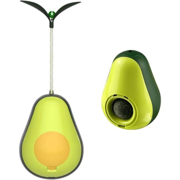 Avokado şeklindeki bu eğlenceli kedi oyuncağı, kedinizin hem oyun hem de ödül zamanı geçirmesi için tasarlanmıştır. Tabanı sayesinde dengede kalır ve kolayca devrilmez. Kediniz dokunduğunda sağa sola sallanarak dikkat çeker, böylece oyun isteğini artırır. İç kısmına kedinizin ödül mamasını veya mama yerleştirilebilir, böylece kedi oynarken ödüllendirilir. Ürünün ön kısmına yerleştirilen kedi otu topu, döner mekanizmayla kedilerin ilgisini çeker ve onları sakinleştirir. Ayrıca, üst kısmındaki yaylı yaprak formundaki çubuk, hareket ettikçe kedinin avcılık içgüdüsünü tetikler. Dayanıklı, toksik olmayan plastikten üretilmiştir ve evde tek kalan kediler için idealdir.