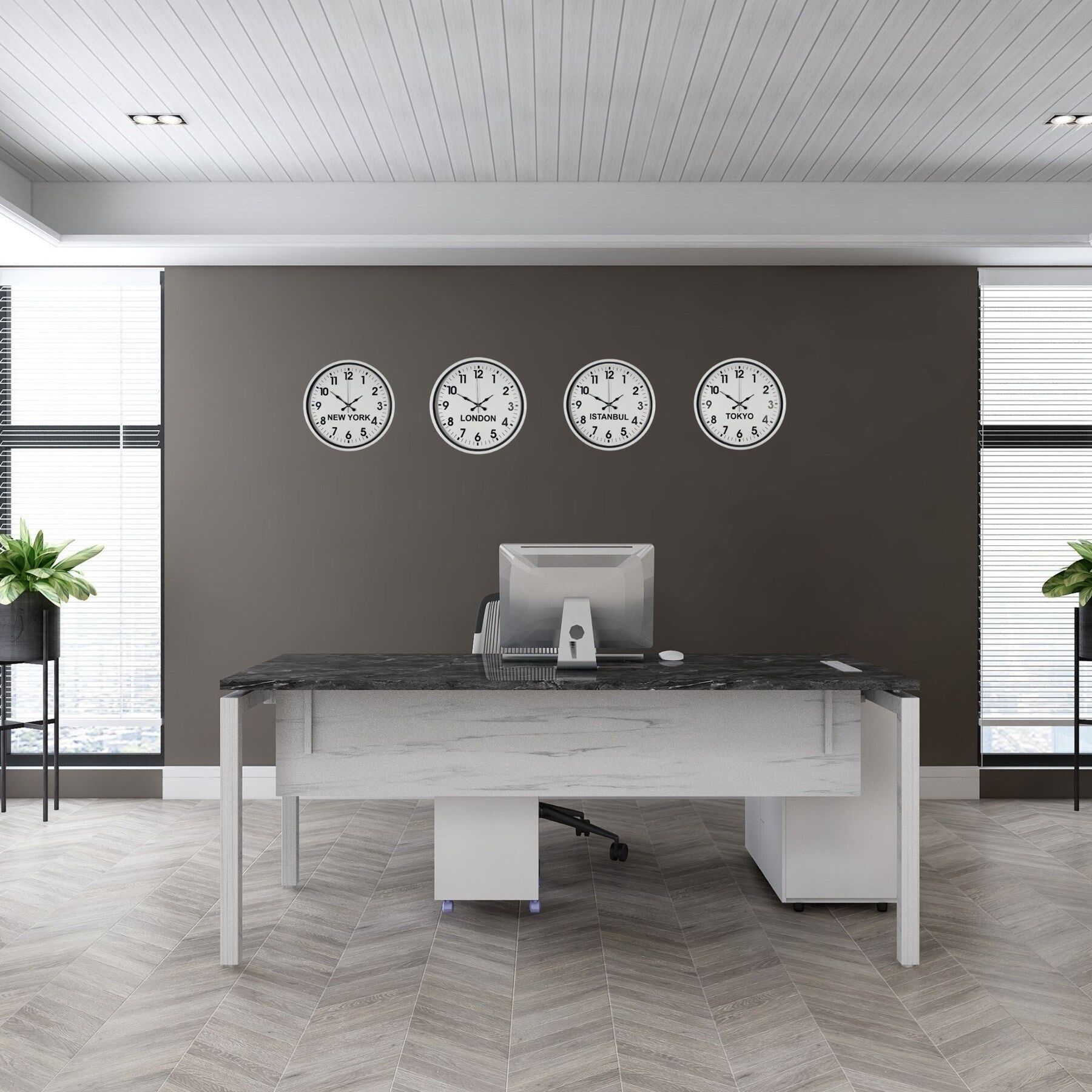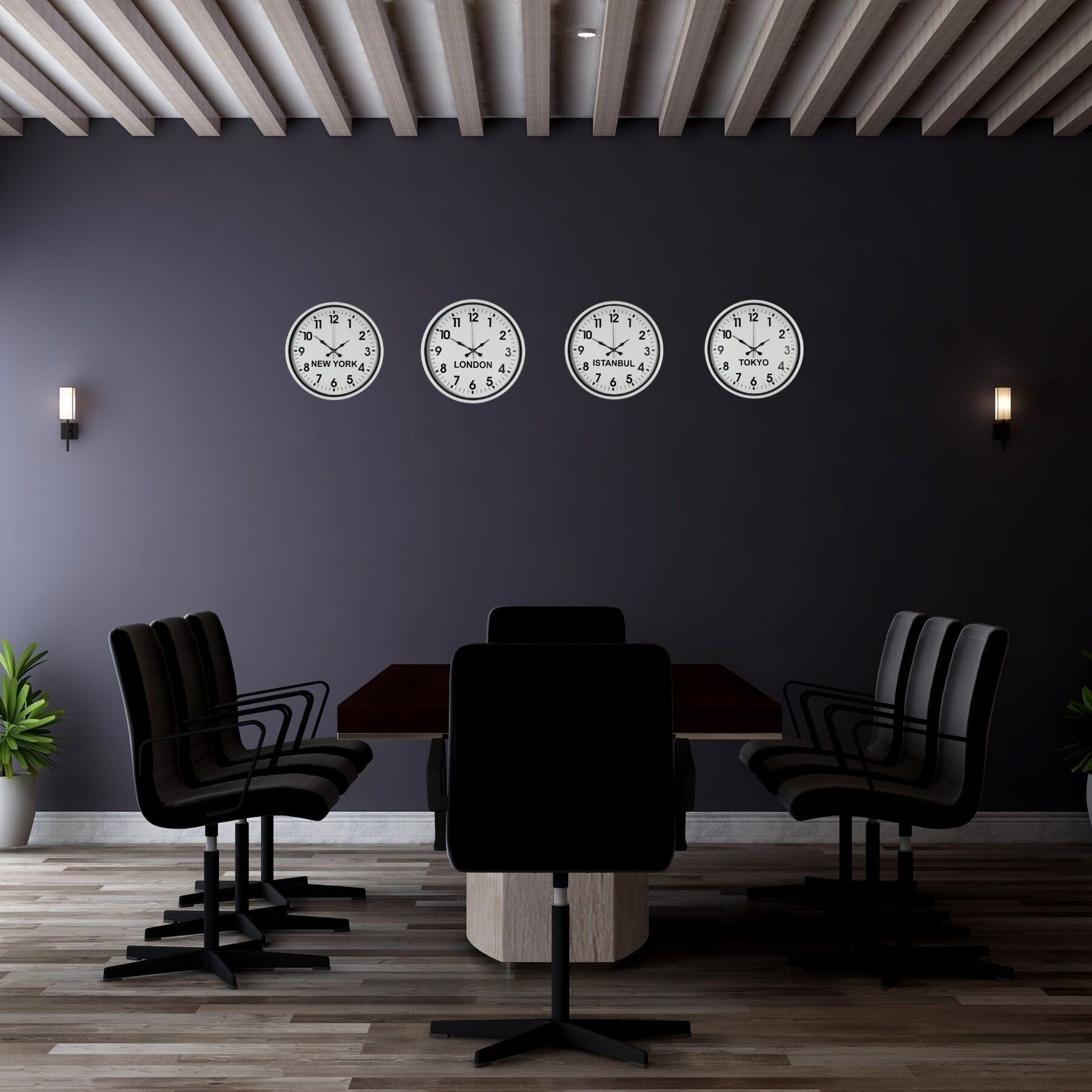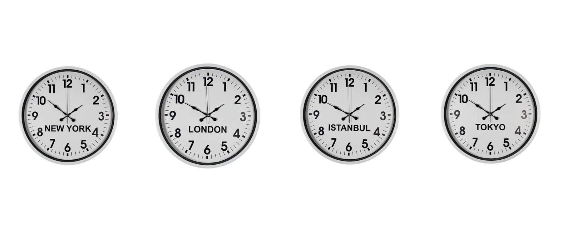 New York, London, Istanbul ve Tokyo saatlerini aynı anda gösteren bu set; özellikle oteller, resepsiyon alanları, ofisler ve uluslararası çalışan işletmeler için ideal bir çözümdür. Minimal tasarımı sayesinde dikkat dağıtmaz, aksine düzenli ve kurumsal bir atmosfer oluşturur.