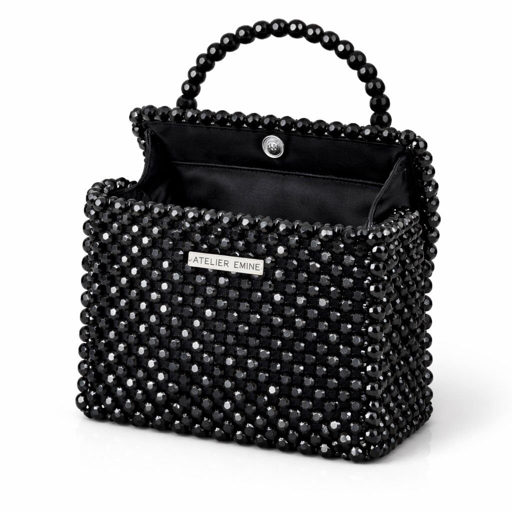 Çanta gövdesi, 8 mm standart yuvarlak kesim optik sınıfı kristal boncukların, yüksek dayanımlı monofilament misina kullanılarak yüksek yoğunluklu düz örgü tekniğiyle tek tek işlenmesi sonucu tamamen el işçiliğiyle oluşturulmuştur. Kristallerin sık ve homojen dizilimi, yüzey boyunca kesintisiz bir parlaklık sağlarken; örgü yapısı çantanın desteksiz şekilde formunu koruyabilen rijit bir yapı kazanmasını mümkün kılar.