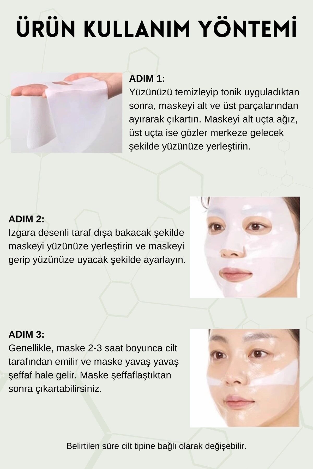 Maske yüzünüzde 3-4 saat bekletin veya en iyi sonuçlar için gece boyunca bırakın.