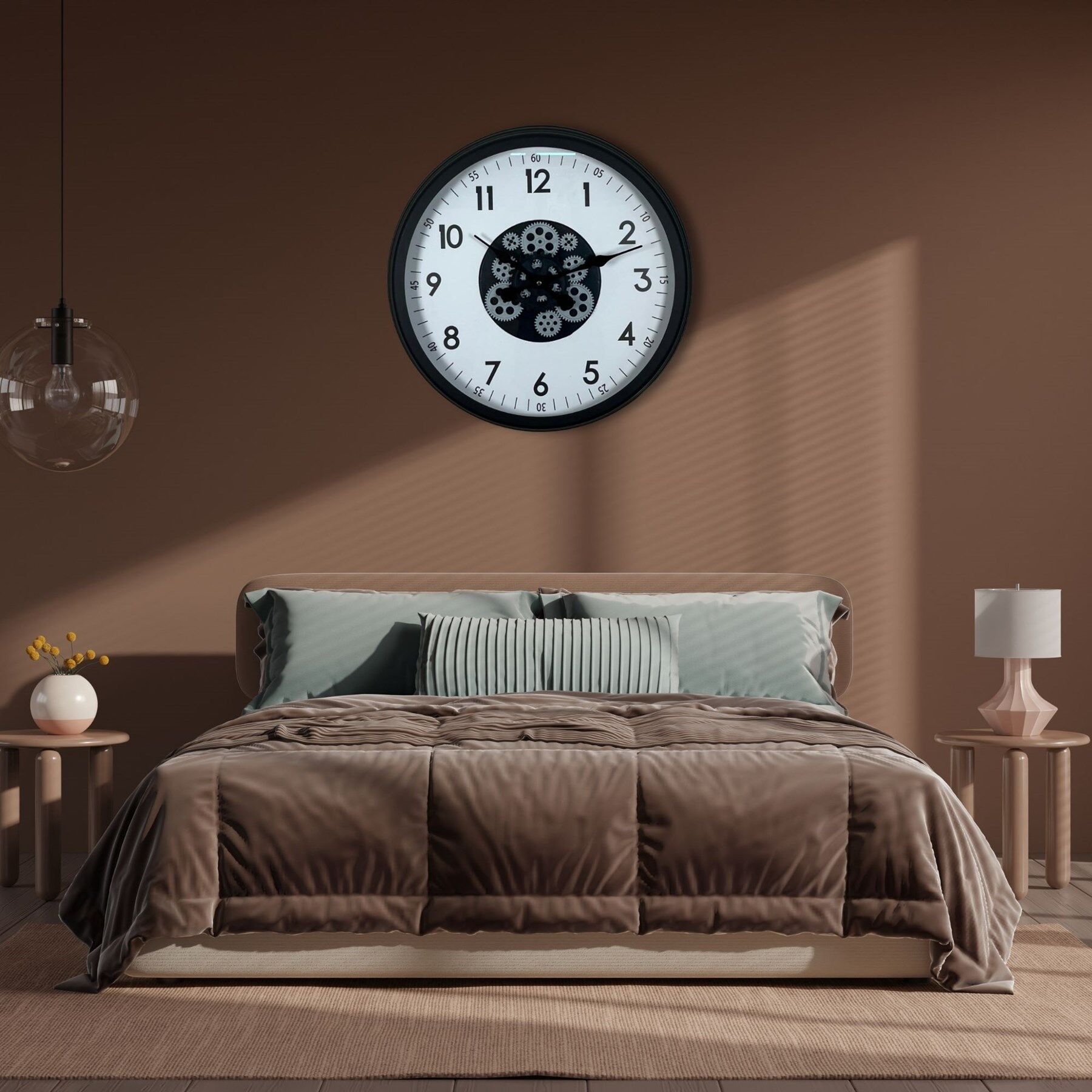 Orta bölümde yer alan hareketli çark mekanizması saate dinamik ve dikkat çekici bir görünüm kazandırır. Minimal tasarım ile mekanik detayların birleşimi, ürünü hem modern hem de dekoratif bir odak noktası haline getirir.