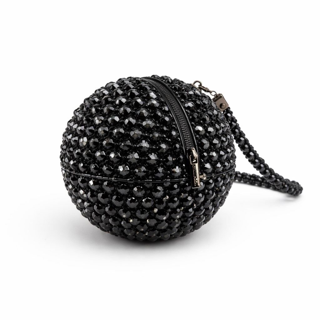 Kristal boncuklar, yüzey boyunca homojen dağılım sağlayacak şekilde örülmüş; küre formu, her açıdan dengeli ve simetrik bir siluet sunacak biçimde yapılandırılmıştır. Yoğun kristal örgü, çantanın formunu kendi kendine taşımasına olanak tanırken, yüzeyde kesintisiz ve akıcı bir ışık yansıması oluşturur.