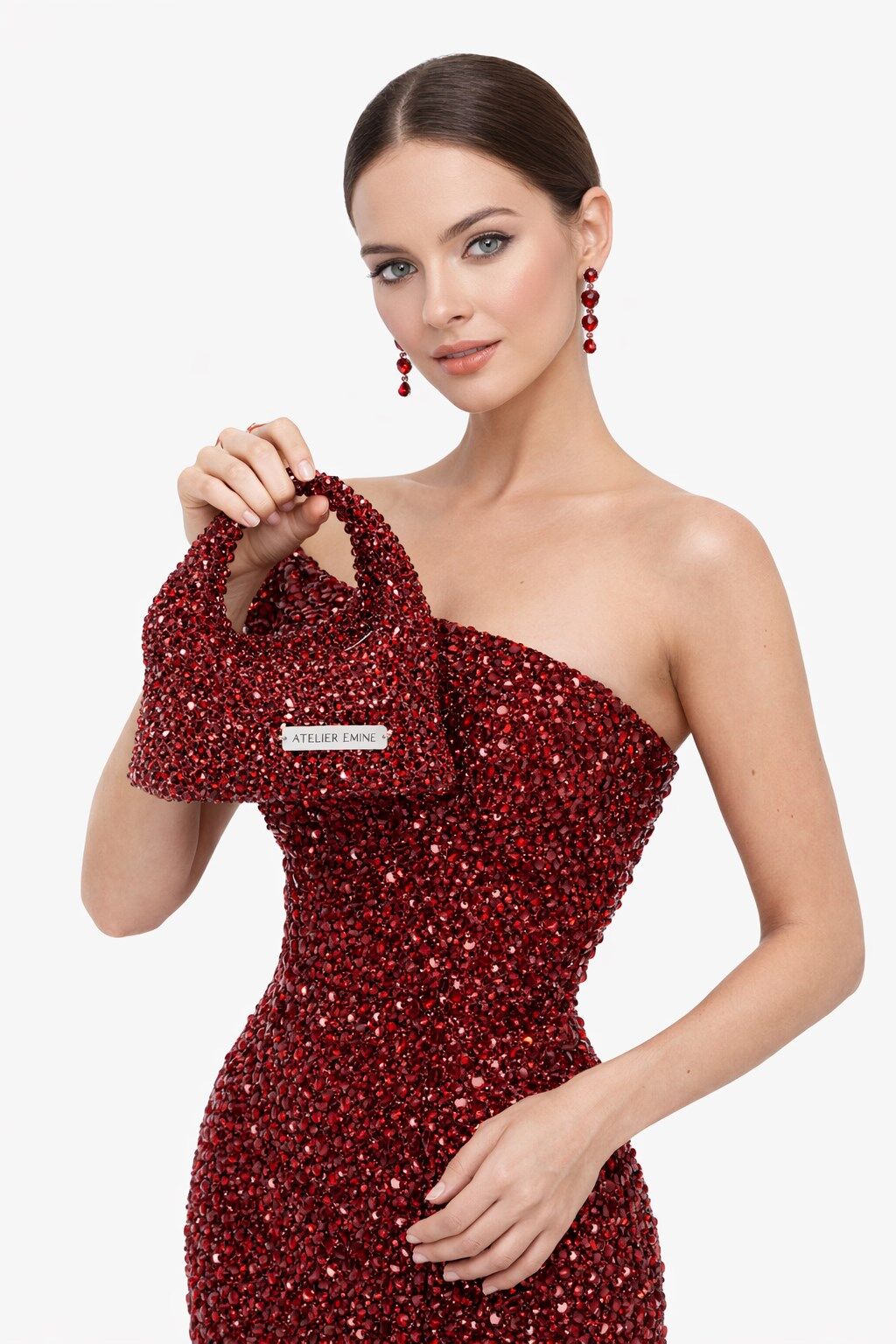 Atelier Emine’in Crystal Gelato Couture koleksiyonuna ait Budino Amarena, 8 mm optik sınıfı kristal boncukların yüksek dayanımlı misina ile tek tek örülmesiyle tamamen el işçiliğiyle üretilmiş, yumuşak geçişli heykelsi formda premium mini çanta modelidir.