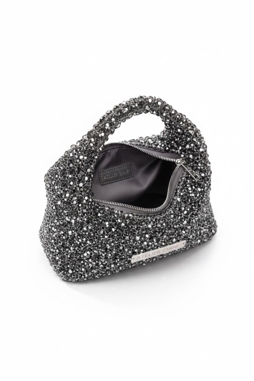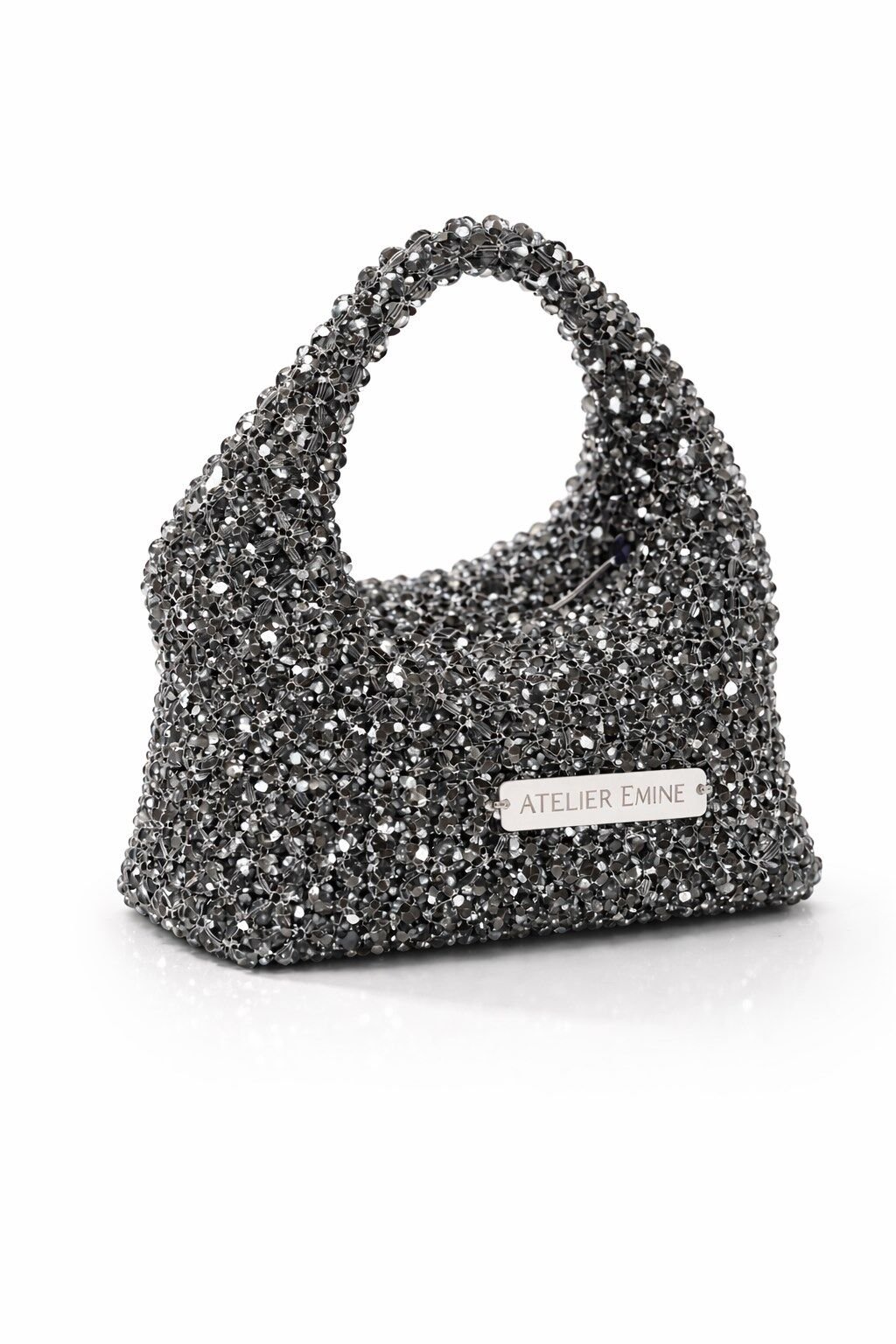 Atelier Emine’in Crystal Gelato Couture koleksiyonuna ait Budino Grafite, 8 mm optik sınıfı kristal boncukların yüksek dayanımlı misina ile tek tek örülmesiyle tamamen el işçiliğiyle üretilmiş, yumuşak geçişli heykelsi formda premium mini çanta modelidir.