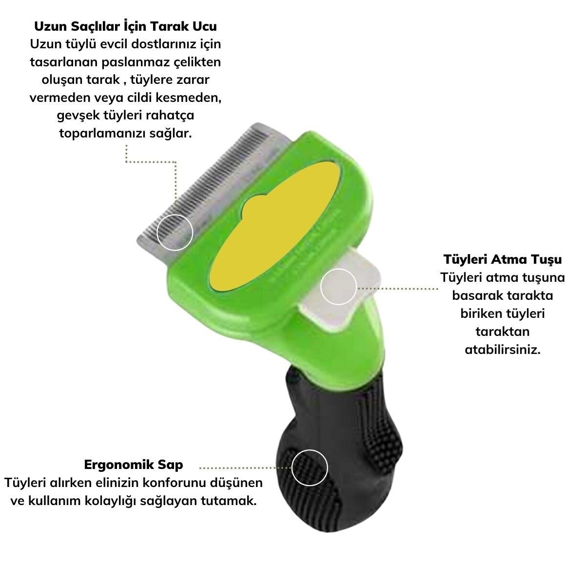 Düzenli kullanımlarda evinizde dökülecek olan tüylerin %90 oranında azalmasını sağlarBuffer Kedi ve Köpekler İçin Uzun Tüylü Köpek Tarağı sadece dökülen değil dökülmek üzere olan tüm tüyleri de evcil hayvanızın üzerinden toplayacaktır