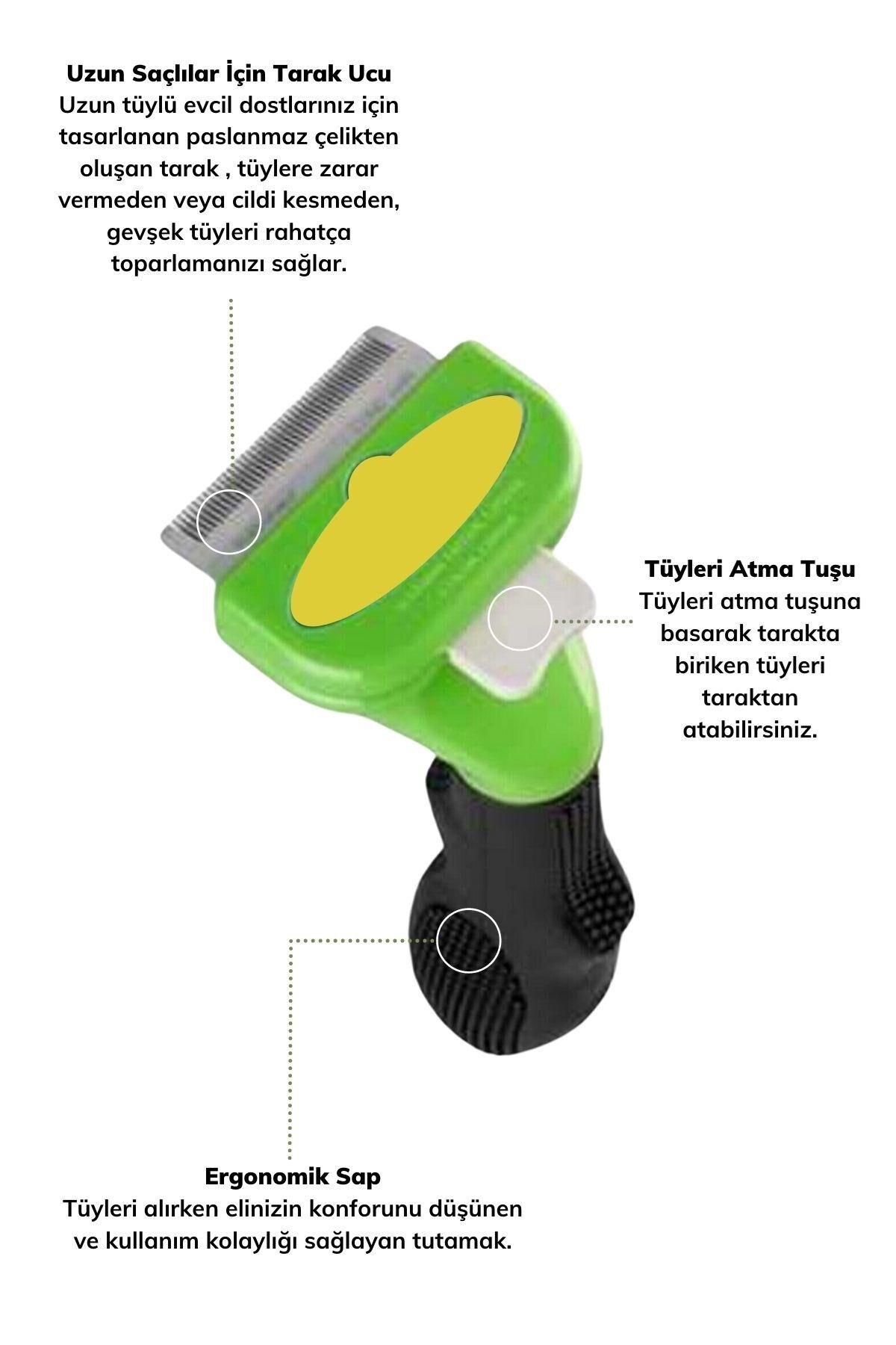 Buffer Kedi ve Köpekler İçin Uzun Tüylü Köpek Tarağı Tüy Toplayıcı tarak evcil hayvanızın vazgeçilmezi olacak Dökülmüş ve kopmuş tüylerini kedi veya köpeğinizin üzerinden evcil hayvanıza zarar vermeden rahatça toplamanıza yardımcı olur Kedi veya köpeğinizin derisine zarar vermez