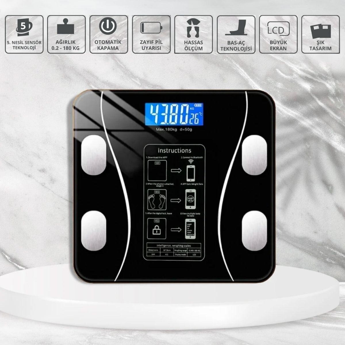 BUFFER® Dijital Baskül Yağ Ölçer Fonksiyonlu Akıllı Baskül – Bluetooth Bağlantılı Tartı