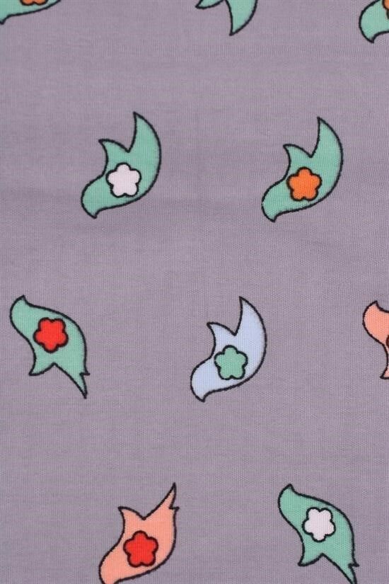 Gri kumaş zemini üzerine renkli kuş baskıları vardır
