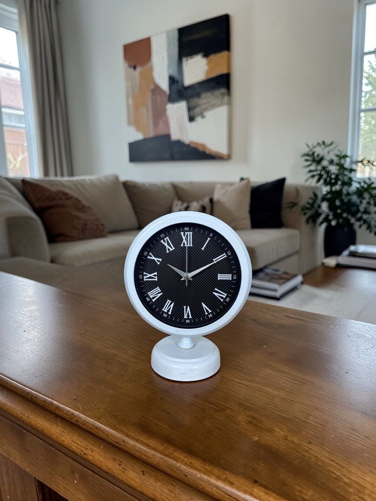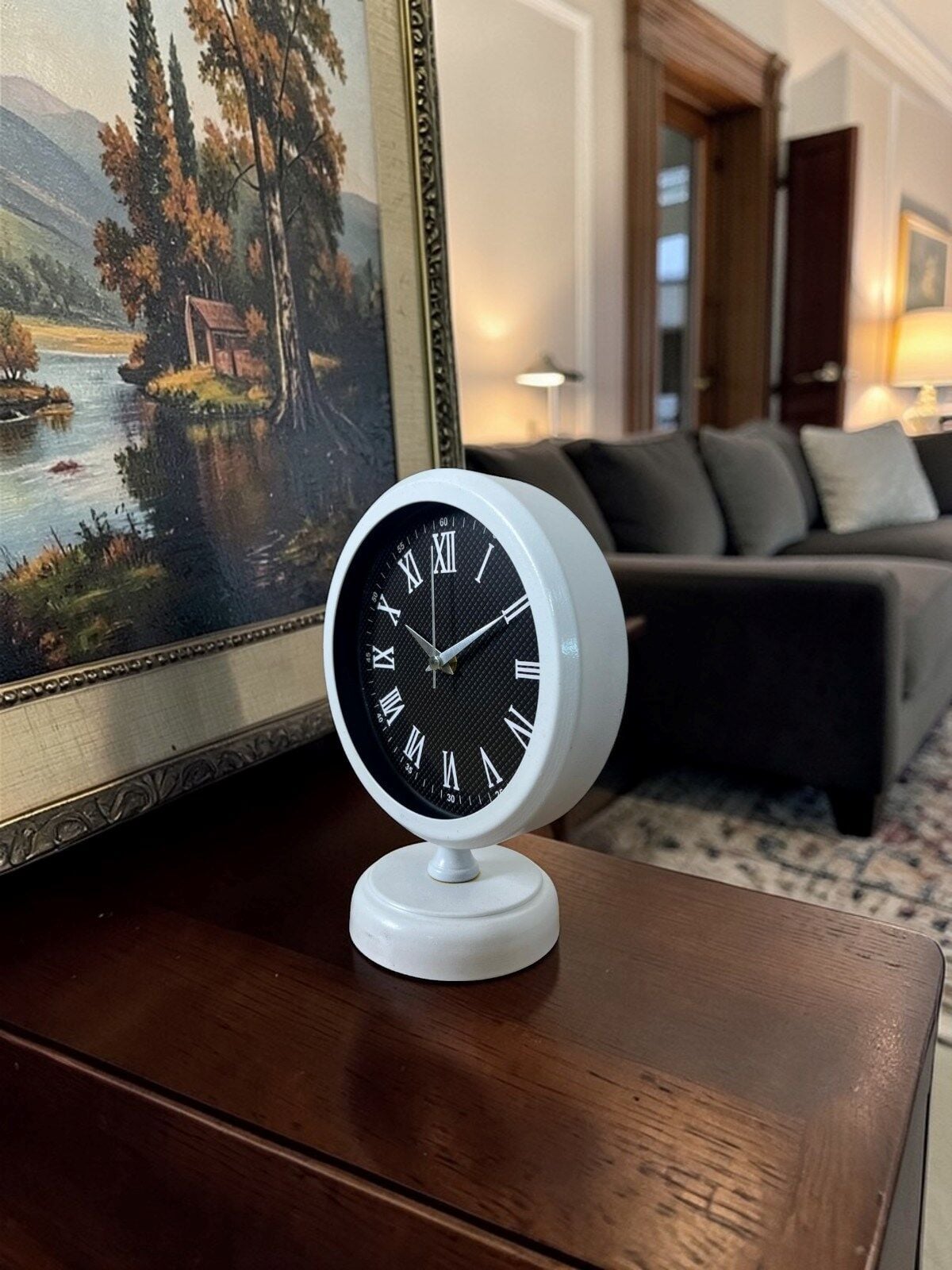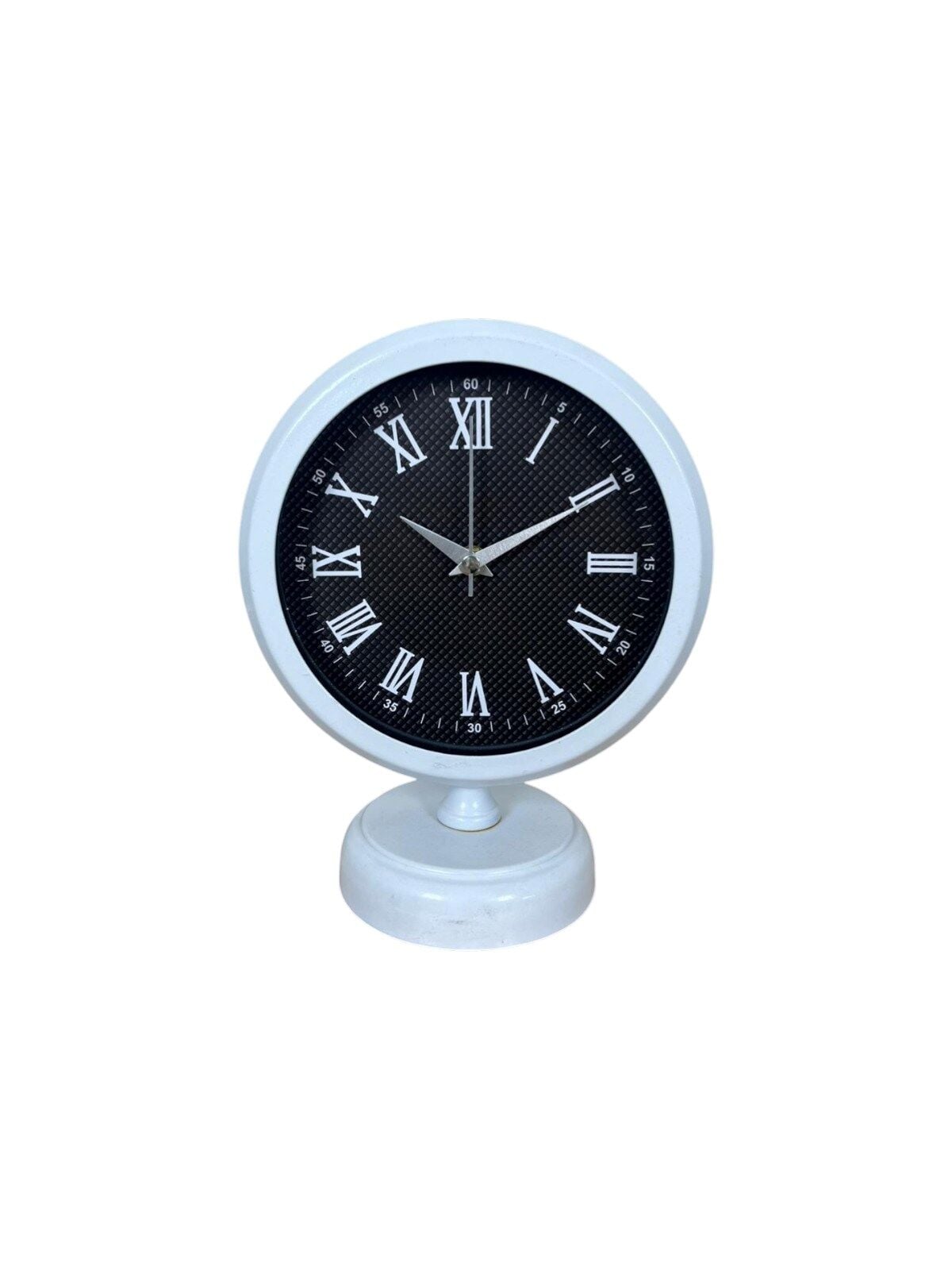 Dokulu siyah kadranı ve Roma rakamlı tasarımıyla dikkat çeken bu masa saati, modern ve güçlü bir stil sunar. Beyaz kasası ile kontrast oluşturarak bulunduğu ortama şık ve dikkat çekici bir görünüm kazandırır. Yüzeyindeki özel dokulu yapı sayesinde sıradan saatlerden ayrılır ve premium bir hissiyat sunar. Hem dekoratif hem de fonksiyonel yapısıyla ofis, salon, yatak odası ve çalışma alanlarında rahatlıkla kullanılabilir. Sessiz akan saniye mekanizması sayesinde tik tak sesi oluşturmaz, huzurlu bir kullanım sağlar. Gerçek cam yüzeyi ile hem dayanıklılık hem de net bir görünüm sunar.