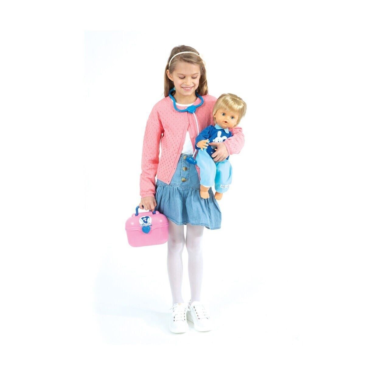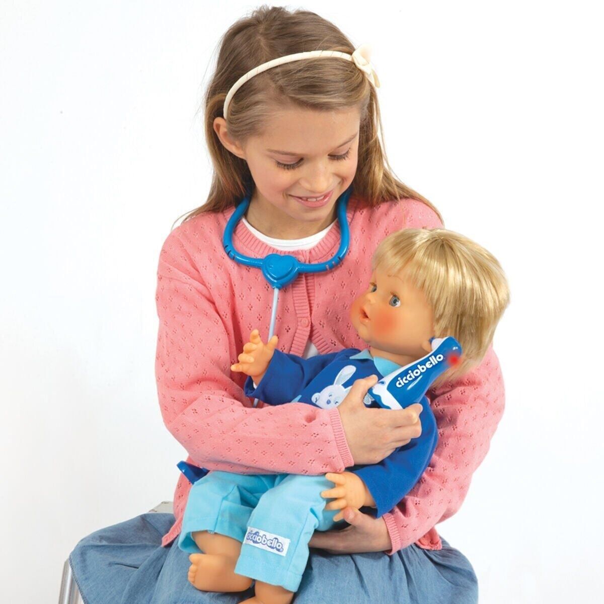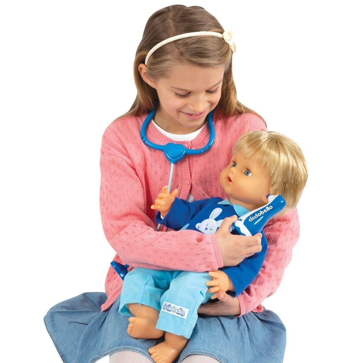Kullanım şekli: Cicciobello bebek, kutudan tulumu giyili halde çıkarılıyor ve düz bir zemin üzerine yatırılarak oyuna hazırlanıyor. Bebek, dahili ses modülü sayesinde belirli aralıklarla hasta sesleri ve öksürük efektleri çıkarıyor. Bu sesler, bakım temalı rol oyununu başlatmak için kullanılıyor. Termometre, bebeğin koltuk altına veya ağzına tutuluyor ve LED ışığı yanarak ölçüm yapıldığı hissi veriliyor. Stetoskop, kalp atışı dinleme oyunu için kullanılıyor. Enjektör ile ilaç verme oyunu canlandırılıyor; şeffaf tüpü sayesinde gerçekçi bir görünüm sunuluyor. Farklı renkteki ilaç şişeleriyle tedavi süreci tamamlanıyor. Uyku zamanı geldiğinde tavşan şeklindeki emzik bebeğe takılıyor ve karanlıkta hafifçe parlayan yapısıyla gece oyunlarına eşlik ediyor. Oyuncak mendil kutusu ile bakım aşaması destekleniyor. Tüm aksesuarlar oyun sonunda taşıma çantasına yerleştiriliyor ve ürün kolayca taşınabiliyor.