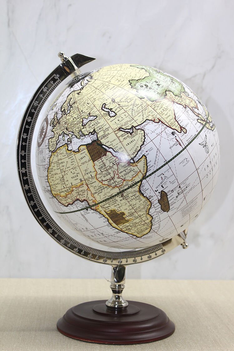 Dekoratif Masaüstü Dünya Küre - Model 15, açık krem ve bej tonlarının hâkim olduğu klasik atlas tasarımı ile zamansız bir dekoratif şıklık sunar. 40x30 cm ölçüsü sayesinde büyük boy formda tasarlanmış olup masa üzerinde güçlü ve dengeli bir duruş sergiler. Açık zemin üzerine işlenmiş kıta detayları, daha aydınlık ve ferah bir atlas görünümü oluştururken metal meridyen halkası ve koyu ahşap görünümlü kaide tasarımı ürüne klasik bir karakter kazandırır. büyük boy masaüstü dünya küre arayan kullanıcılar için ideal ölçüye sahip olan bu model, yönetici masası, ofis konsolu, salon sehpası ya da geniş kitaplık raflarında prestijli bir odak noktası oluşturur. Hem klasik hem modern dekorasyon stilleriyle uyum sağlayabilen dekoratif atlas dünya küresi, bulunduğu ortamda entelektüel ve sofistike bir atmosfer yaratmak isteyenler için estetik bir tercihtir. Sağlam stand yapısı sayesinde dengeli kullanım sunar ve uzun süreli dekoratif kullanım için uygundur.