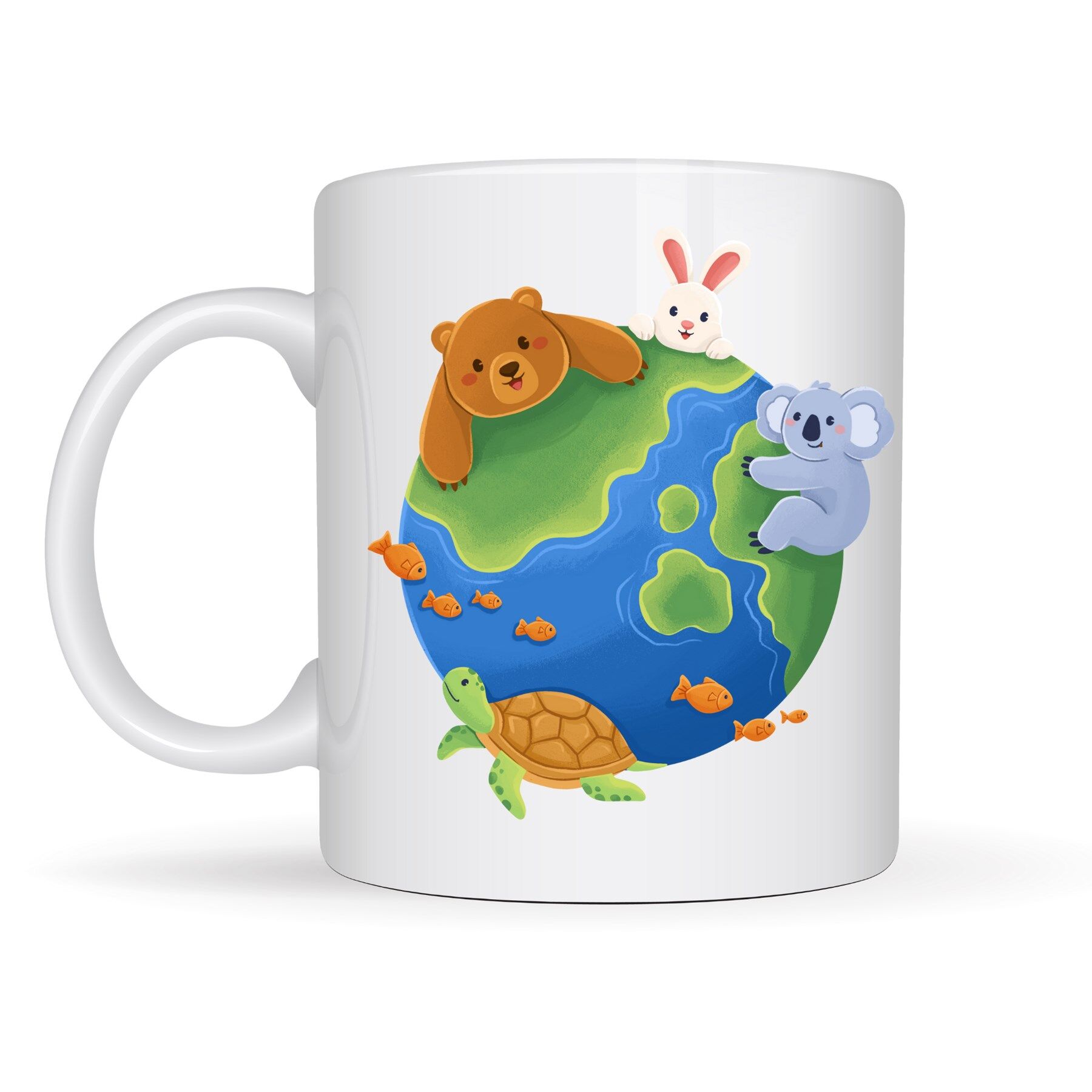 Bu sevimli porselen kupa, dünyayı kucaklayan tatlı hayvan figürleriyle sıcaklık, dostluk ve doğa sevgisini bir araya getiriyor. ????????