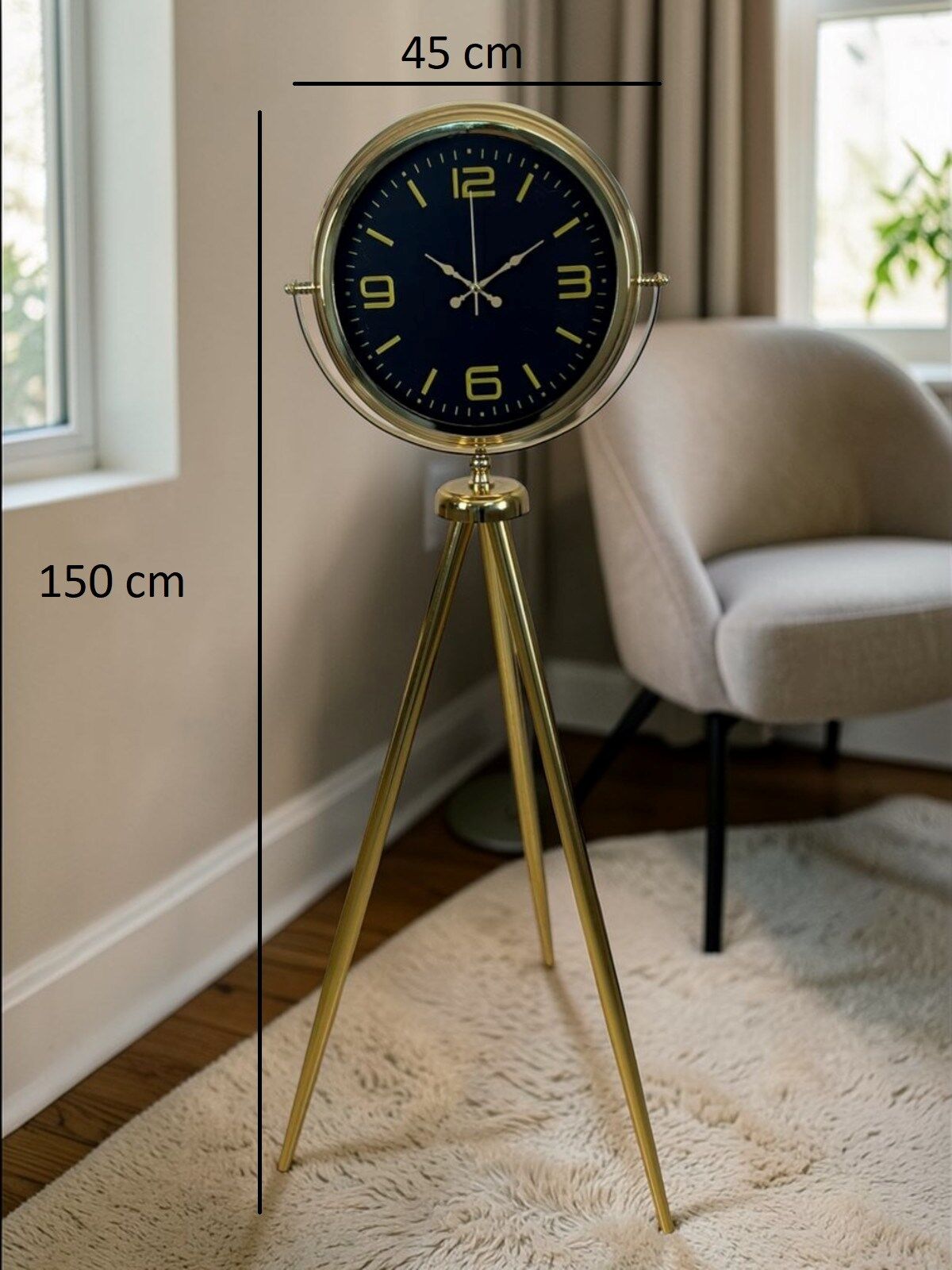 Modern ve şık tasarımıyla dikkat çeken Gold Tripod Ayaklı Dekoratif Salon Saati, gold metal gövdesi ve zarif tripod ayak yapısıyla yaşam alanlarınıza estetik bir dokunuş kazandırır. Lacivert kadranı ve gold detayları sayesinde bulunduğu ortama hem modern hem de lüks bir görünüm katar.