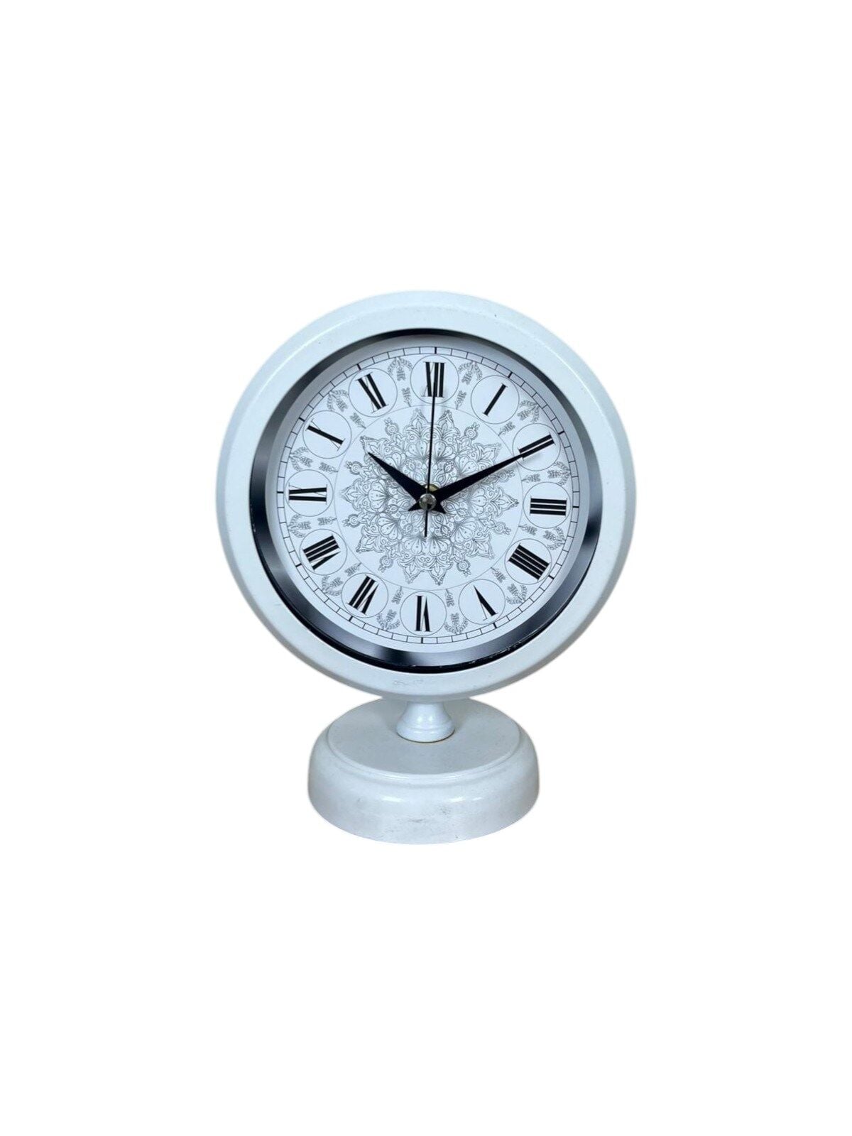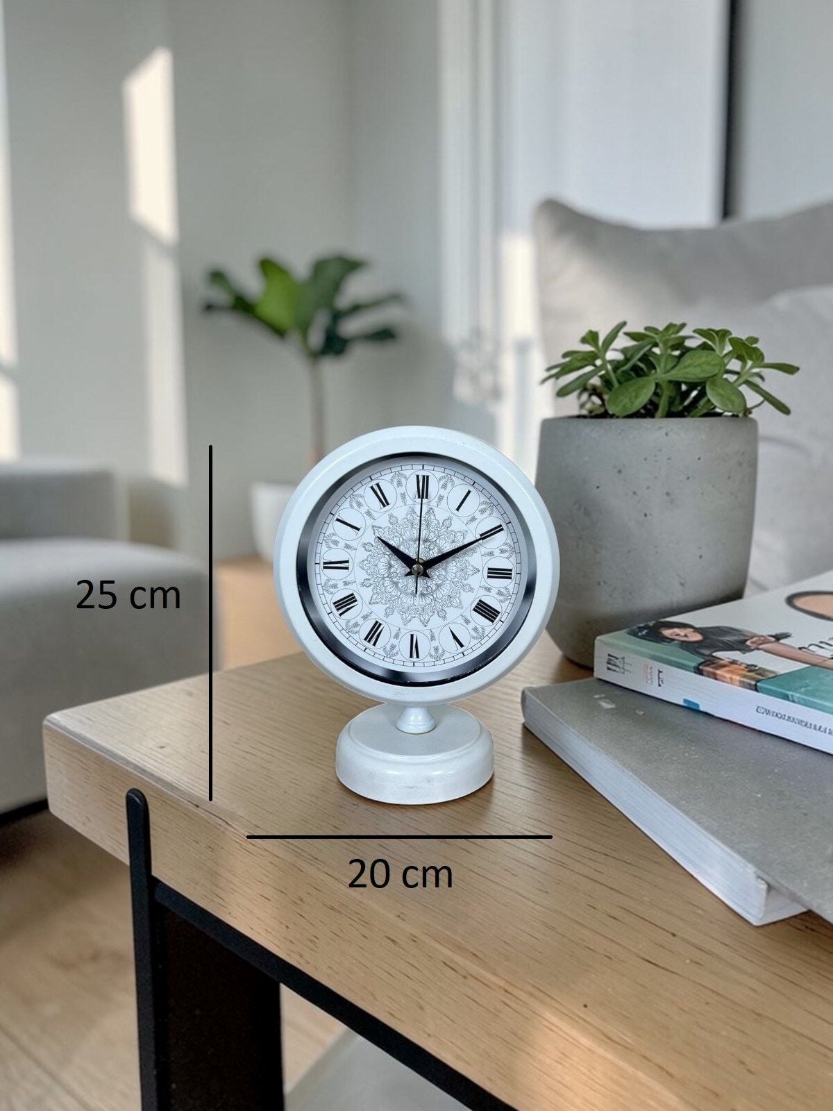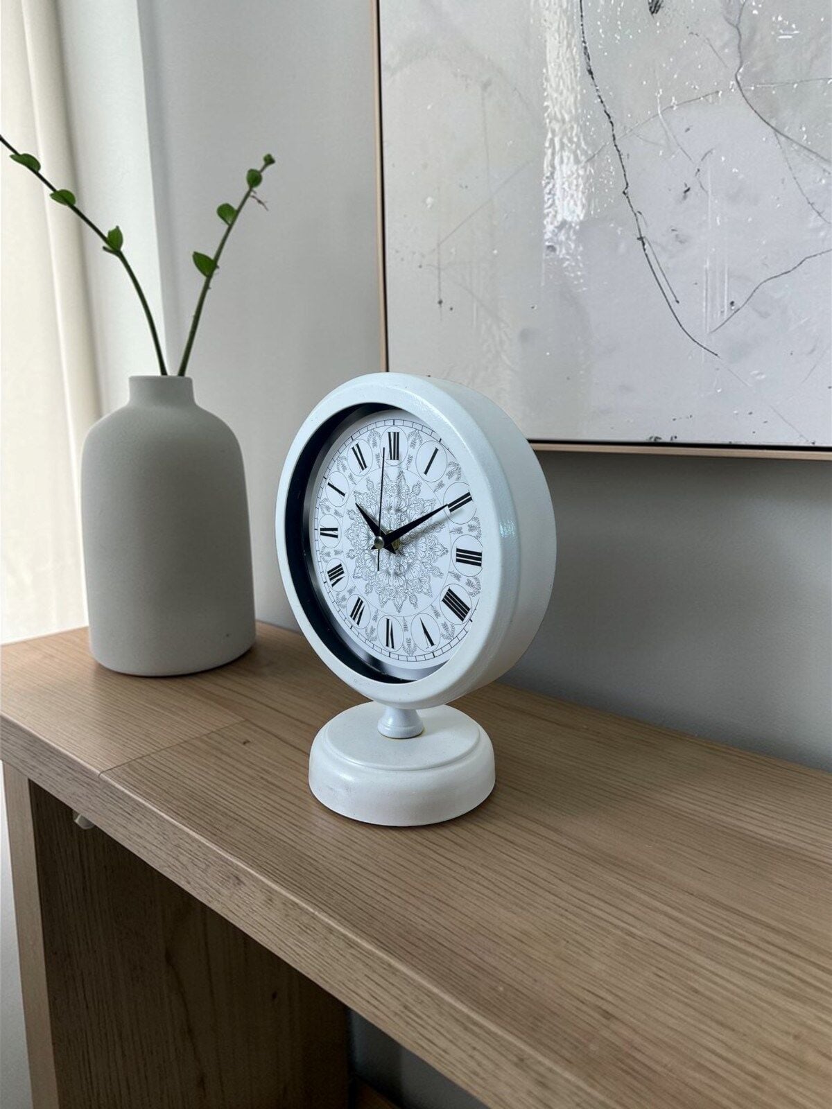 Zarif mandala deseni ve Roma rakamlı klasik tasarımıyla öne çıkan bu masa saati, bulunduğu ortama estetik ve modern bir dokunuş kazandırır. Krom detaylı çerçevesi ve beyaz kasa yapısı sayesinde hem şık hem de dikkat çekici bir görünüm sunar. Dekoratif yapısıyla yaşam alanlarının tamamlayıcısı olurken, okunaklı kadranı ile fonksiyonel kullanım sağlar. Ofis, salon, yatak odası ve çalışma alanlarında zarif bir detay olarak öne çıkar. Sessiz akan saniye mekanizması sayesinde tik tak sesi oluşturmaz, huzurlu bir ortam sunar. Gerçek cam yüzeyi ile hem dayanıklılık hem de net ve kaliteli bir görünüm sağlar.