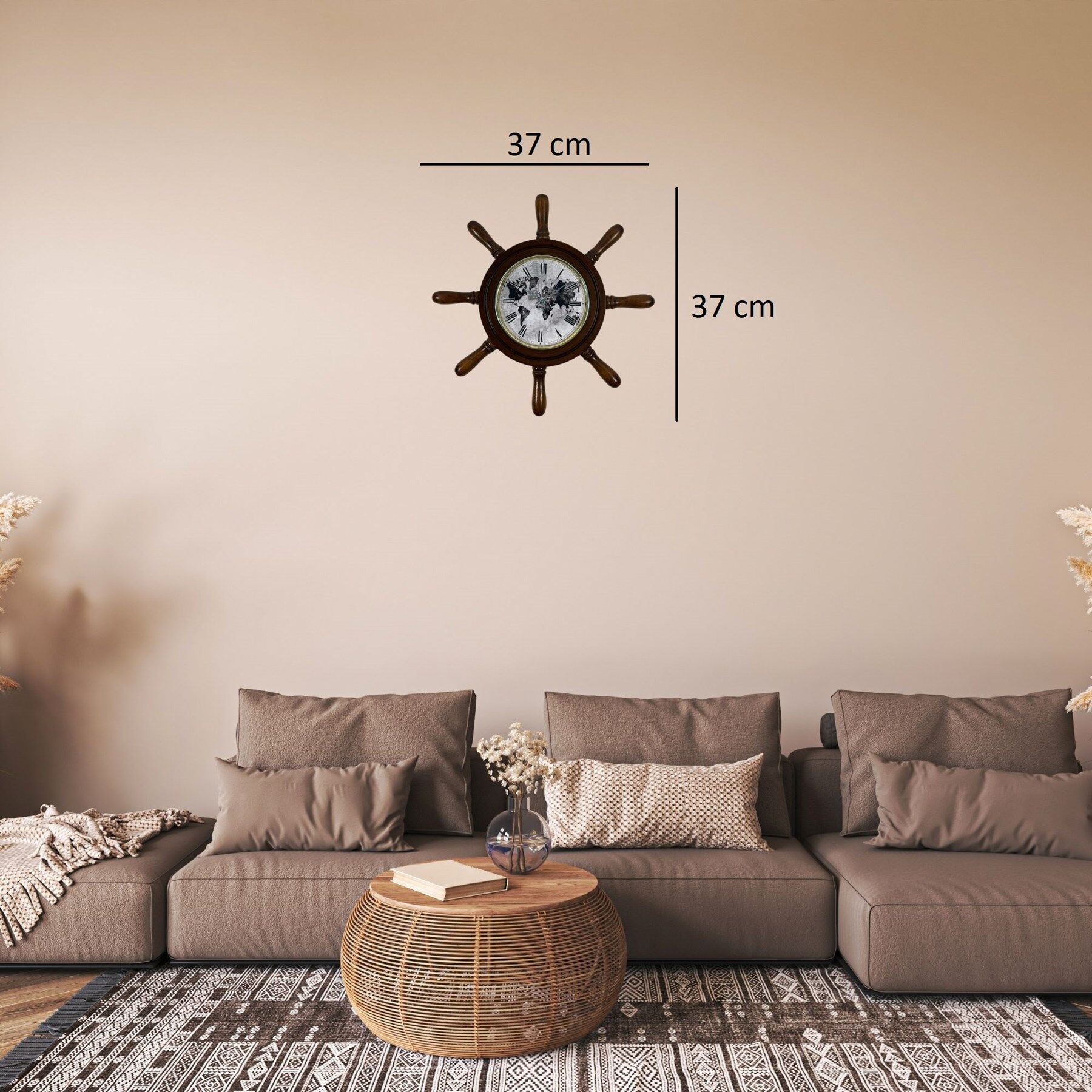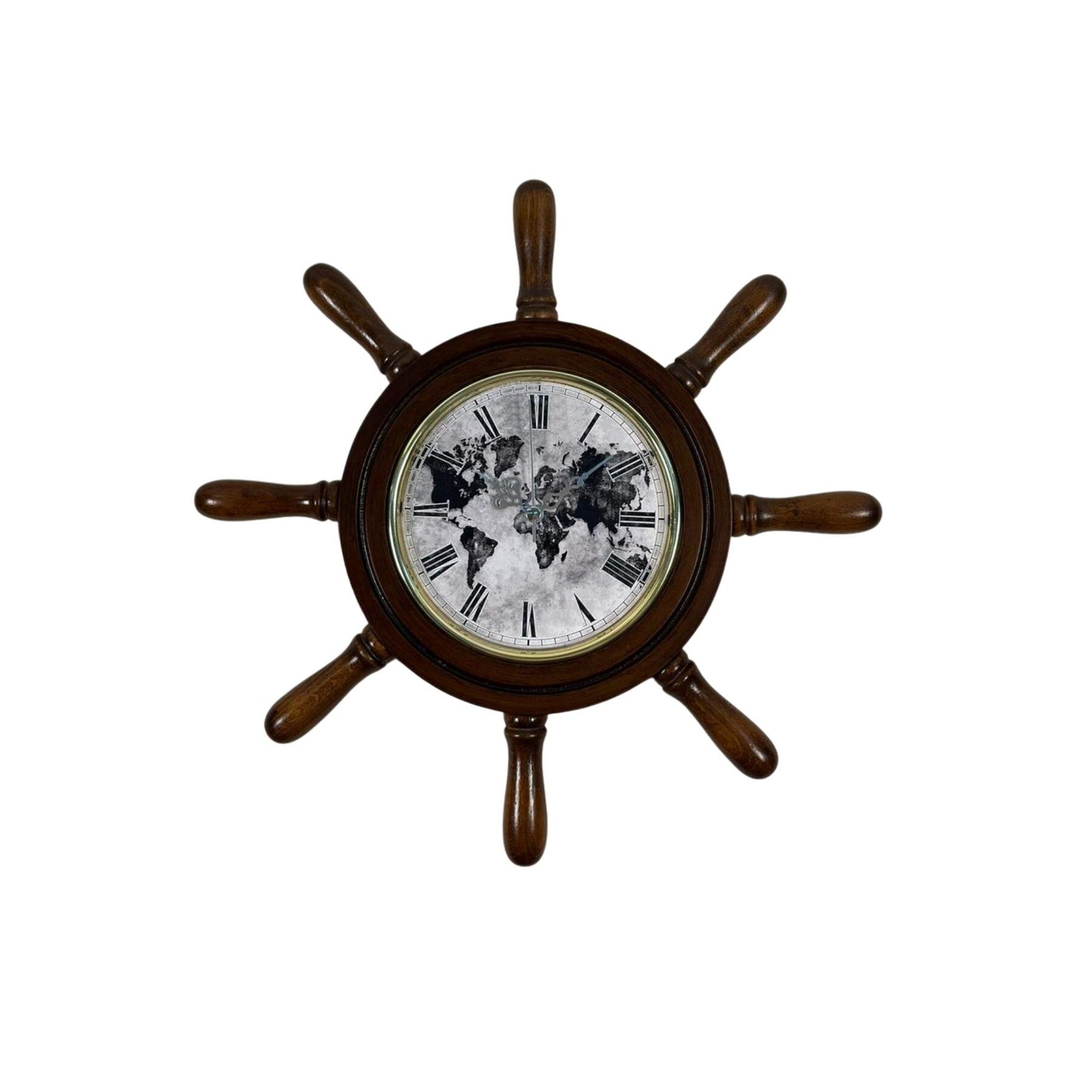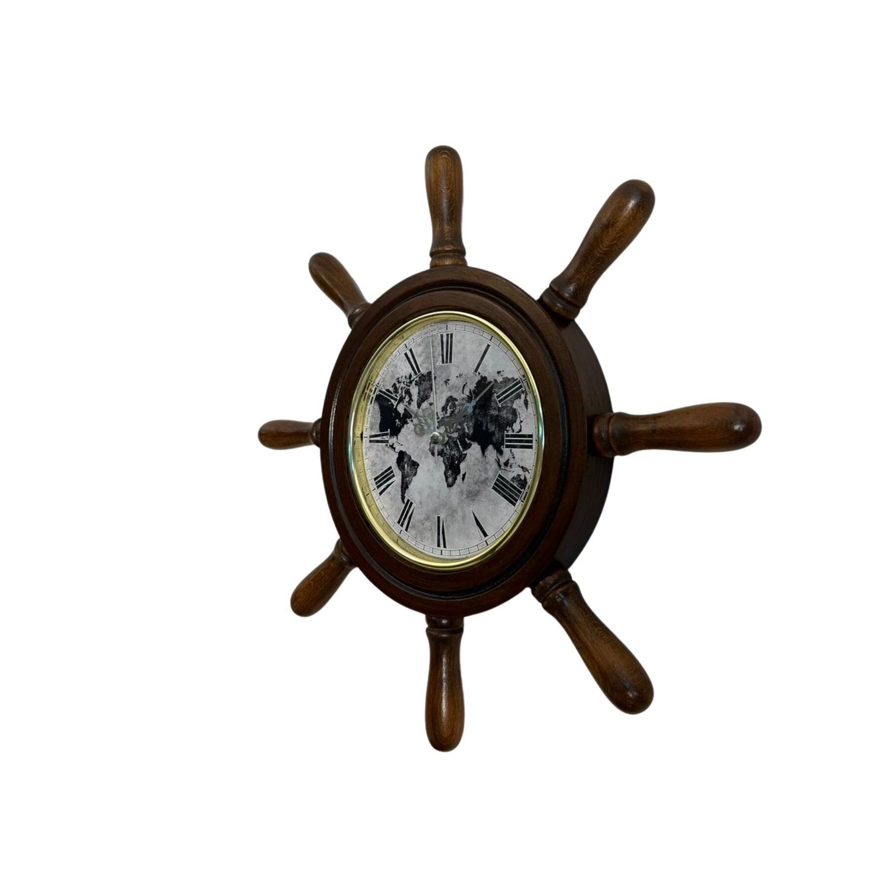 Saatin etrafında bulunan dümen kolları (kavelalar), gerçek bir gemi dümenini andıran detaylı bir tasarıma sahiptir. Bu kavelalar 8 cm uzunluğunda olup saatin marin karakterini güçlendiren estetik bir görünüm sunar. Saat kısmının çapı ise 37 cm olup duvar üzerinde dengeli ve dikkat çekici bir ölçü sunar.