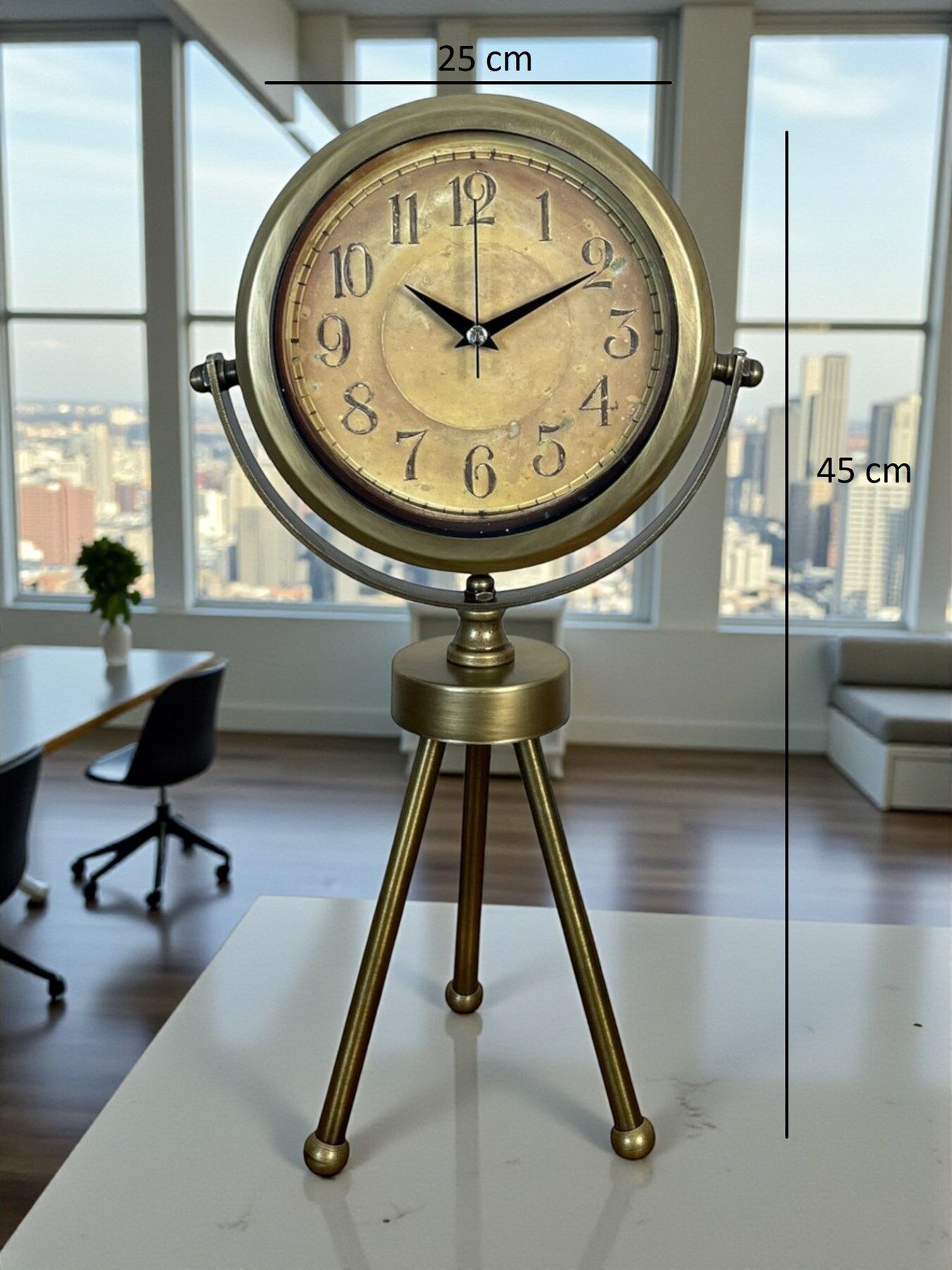 Şıklığı ve zarafeti bir araya getiren Eskitme Üç Ayaklı Metal Masa Saati, modern ve klasik dekorasyon tarzlarına uyum sağlayan özel bir tasarıma sahiptir. Tamamen metal gövde ve eskitme kaplama yüzeyi ile bulunduğu ortama lüks bir dokunuş katarken, üç ayaklı sağlam tripod standı sayesinde hem dengeli hem de dekoratif bir duruş sunar.