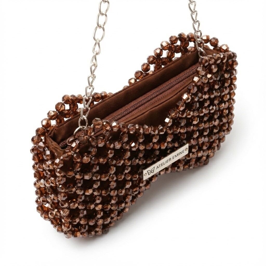 Atelier Emine’in Crystal Gelato Couture serisine ait Fresco Espresso, 8 mm optik sınıfı kristal boncukların yüksek dayanımlı misina ile örülmesiyle tamamen el işçiliğiyle üretilmiş, fiyonk formunda heykelsi bir mini çanta modelidir.