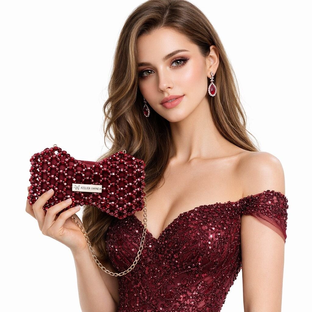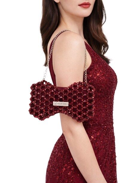 Atelier Emine’in Crystal Gelato Couture serisine ait Fresco Wine, 8 mm optik sınıfı kristal boncukların yüksek dayanımlı misina ile örülmesiyle tamamen el işçiliğiyle üretilmiş, fiyonk formunda heykelsi bir mini çanta modelidir.