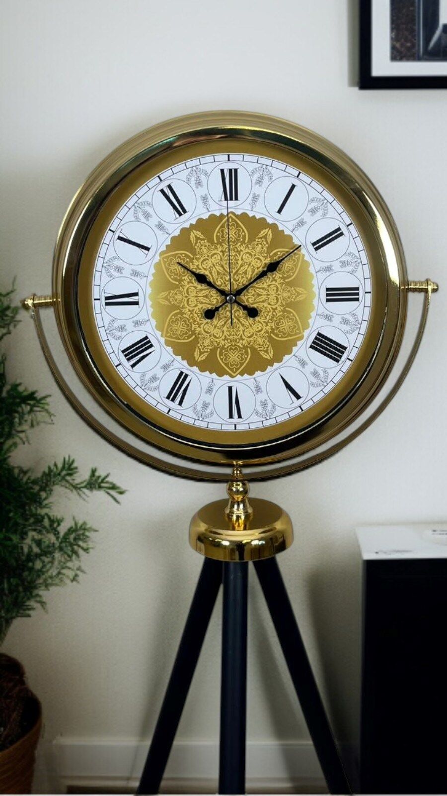 Sanatsal detayları ve zarif duruşuyla öne çıkan bu gold tripod ayaklı yer saati, klasik estetiği modern çizgilerle birleştirerek yaşam alanlarına güçlü bir karakter kazandırır. Saat kadranının merkezinde yer alan altın motifli desen, ürüne dekoratif bir derinlik ve sofistike bir görünüm sunar. Roma rakamlı göstergeler, klasik saat anlayışını yansıtırken; gold çerçeve ile bütünleşerek zamansız bir şıklık oluşturur.