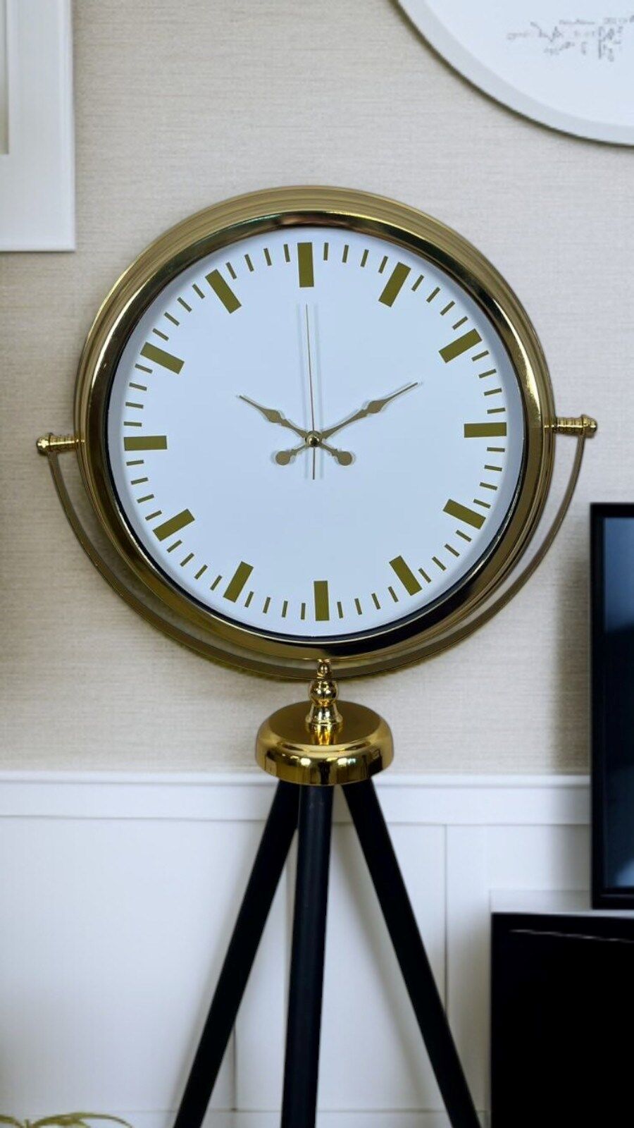 Zamansız tasarımı ve modern çizgileri bir araya getiren Gold Tripod Ayaklı Saat, bulunduğu ortama güçlü bir duruş ve sofistike bir şıklık kazandırır. Gold renkli metal kasası, sade beyaz kadranı ve siyah tripod ayaklarıyla hem klasik hem de modern dekorasyon stilleriyle kusursuz uyum sağlar. Geniş ölçüleri sayesinde yalnızca bir saat değil, aynı zamanda dekoratif bir odak noktası olarak mekânda fark yaratır.