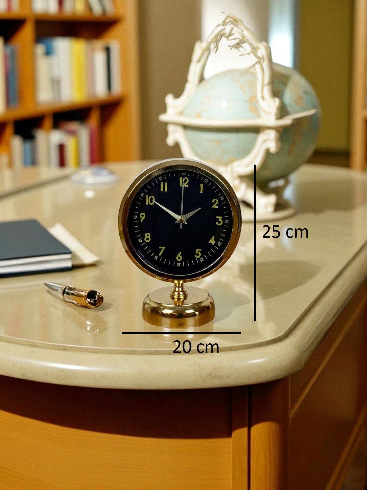 Parlak gold kaplaması ve siyah kadranıyla dikkat çeken bu masa saati, bulunduğu ortama anında şıklık ve prestij kazandırır. Klasik yuvarlak formu, net ve okunaklı rakamlarıyla hem estetik hem de fonksiyonel bir kullanım sunar. Gold gövde ile siyah kadranın kontrastı, modern ve klasik dekorasyon stillerine kusursuz uyum sağlar.