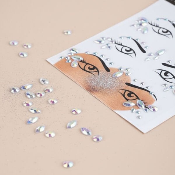 Gümüş taşlı makyaj yüz süsü, “Face Jewels” tasarımı ile hazırlanan dekoratif bir makyaj aksesuarıdır. Ürün, göz çevresi ve kaş üstü bölgesine uygun şekilde konumlandırılmış çoklu taş dizilimlerinden oluşur. Parlak yüzeyli gümüş taş detayları ışığı yansıtan bir görünüm sunar ve yüz makyajında dikkat çekici bir etki oluşturur. Simetrik formda hazırlanan taş yerleşimi, her iki göz çevresinde dengeli bir görünüm sağlar. Farklı boyutlardaki taş kombinasyonu sayesinde tek parça halinde bütüncül bir tasarım sunar. Özel gün makyajlarında, festival stilinde veya sahne makyajında kullanılabilecek Face Jewels yüz süsü, makyaja ışıltılı ve belirgin bir dokunuş kazandırır.