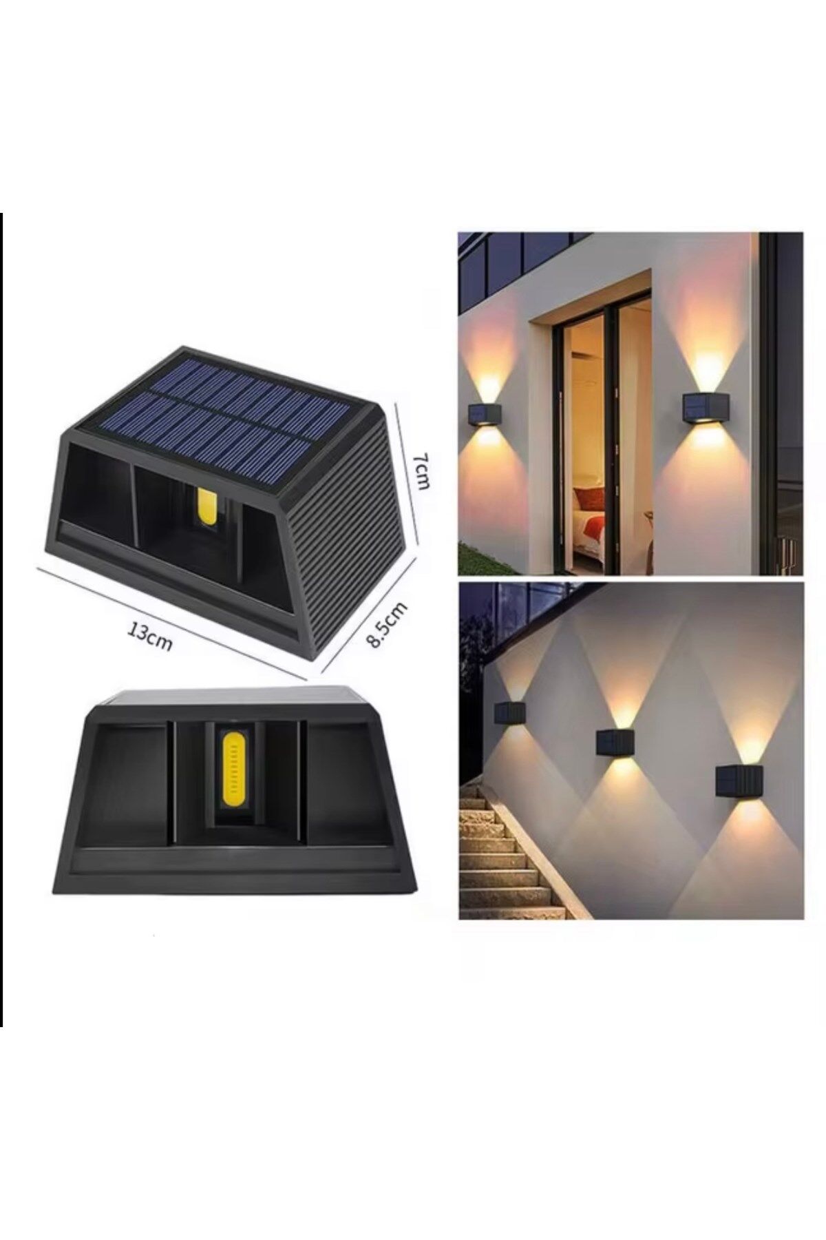 Bu şık ve modern güneş enerjili duvar lambası ile dış mekanlarınızı aydınlatın! Kendinden şarj edilebilir güneş paneli sayesinde elektrik bağlantısına ihtiyaç duymaz, gün boyunca güneş ışığını depolayarak geceleri otomatik olarak yanar.; Çift yönlü aydınlatma tasarımı sayesinde hem yukarı hem de aşağı doğru hoş bir ışık yayarak duvarlarınızda estetik bir ambiyans yaratır.; Suya dayanıklı yapısı ile her türlü hava koşuluna uygun olup, bahçelerinizde, teraslarınızda, balkonlarınızda, kapı girişlerinizde veya merdiven kenarlarında güvenle kullanabilirsiniz.; Kolay kurulumu sayesinde dakikalar içinde monte edilebilir.; Enerji tasarrufu sağlayan ve çevre dostu bu ürünle dış mekanlarınıza modern bir dokunuş katın ve gecelerinizi aydınlatın! Ürün Özellikleri: * Boyutlar: 13 cm (genişlik) x 8.5 cm (derinlik) x 7 cm (yükseklik) * Enerji Kaynağı: Güneş enerjili * Aydınlatma Yönü: Çift yönlü (yukarı ve aşağı) * Malzeme: Dayanıklı ve suya dayanıklı malzeme * Kurulum: Kolay ve hızlı kurulum Kullanım Alanları: * Bahçe Duvarları * Teraslar * Balkonlar * Kapı Girişleri * Merdiven Kenarları * Garaj Girişleri ve daha fazlası!