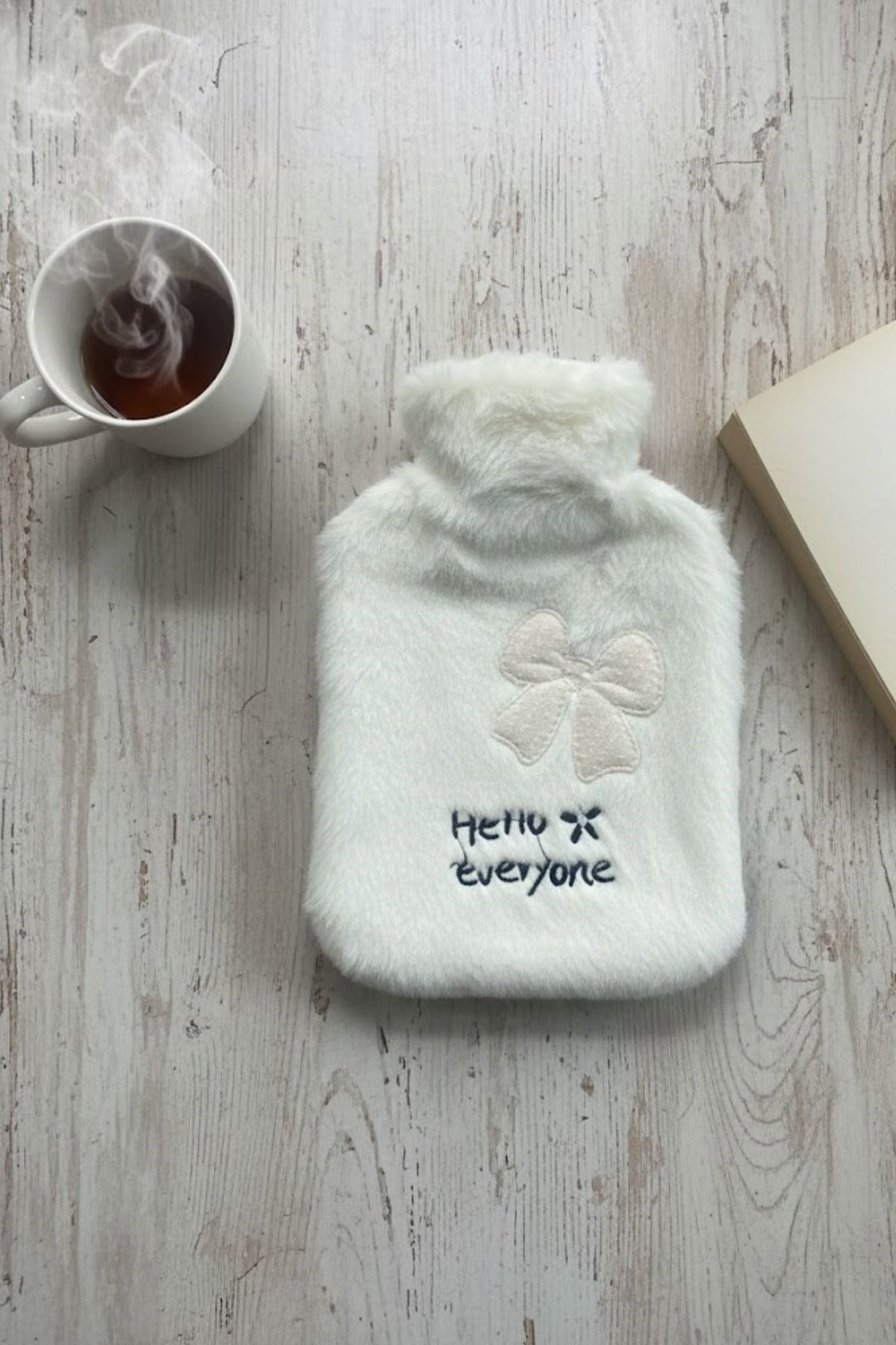 Hello Everyone Yazılı Kurdeleli Beyaz Peluş Sıcak Su Torbası 1 Lt – Yumuşak Kılıf, Uzun Süre Sıcak Tutan Termal Su Torbası