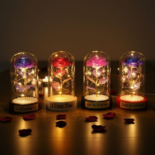 İncili sonsuzluk gülü ledli fanus, zarif detayları ve anlam yüklü tasarımıyla yaşam alanlarına romantik bir ambiyans kazandıran dekoratif bir üründür. Şeffaf fanus içerisinde yer alan sonsuzluk formundaki yapay gül, taban kısmındaki inci detaylarıyla estetik bir bütünlük sunar. Sahip olduğu gün ışığı LED aydınlatma sayesinde yumuşak ve huzur verici bir ışık yayarak masa, komodin ve raf üzerinde şık bir görünüm oluşturur. Kompakt ölçüsüyle yer kaplamadan kullanılabilen bu model, özel günlerde romantik dekoratif fanus arayanlar için ideal bir tercihtir. Model seçimi yapılamayan ürün, görsellerde yer alan tasarımlardan biri olacak şekilde karışık model gönderimi yapılmaktadır.