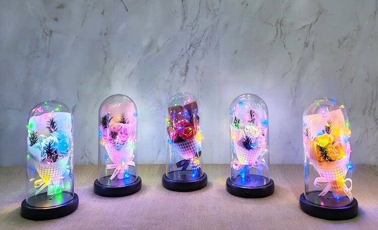 1 adet Işıklı Müzikli Fanus İçinde Gül Buketi