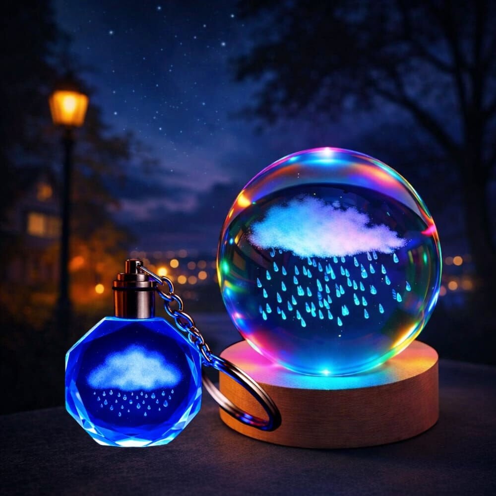 IŞIKLI YAĞMUR BULUTU TASARIMLI KRİSTAL CAM KÜRE VE ANAHTARLIK SETİ