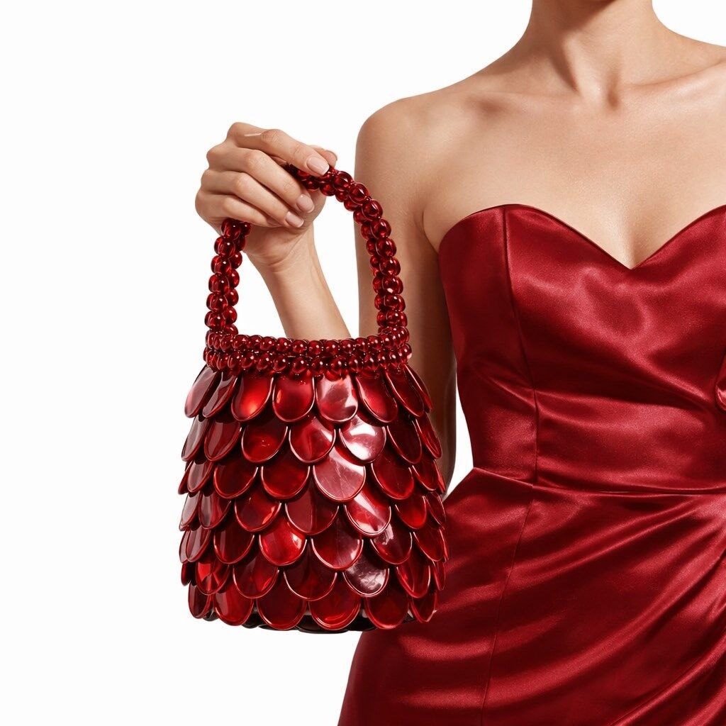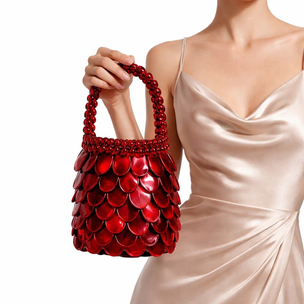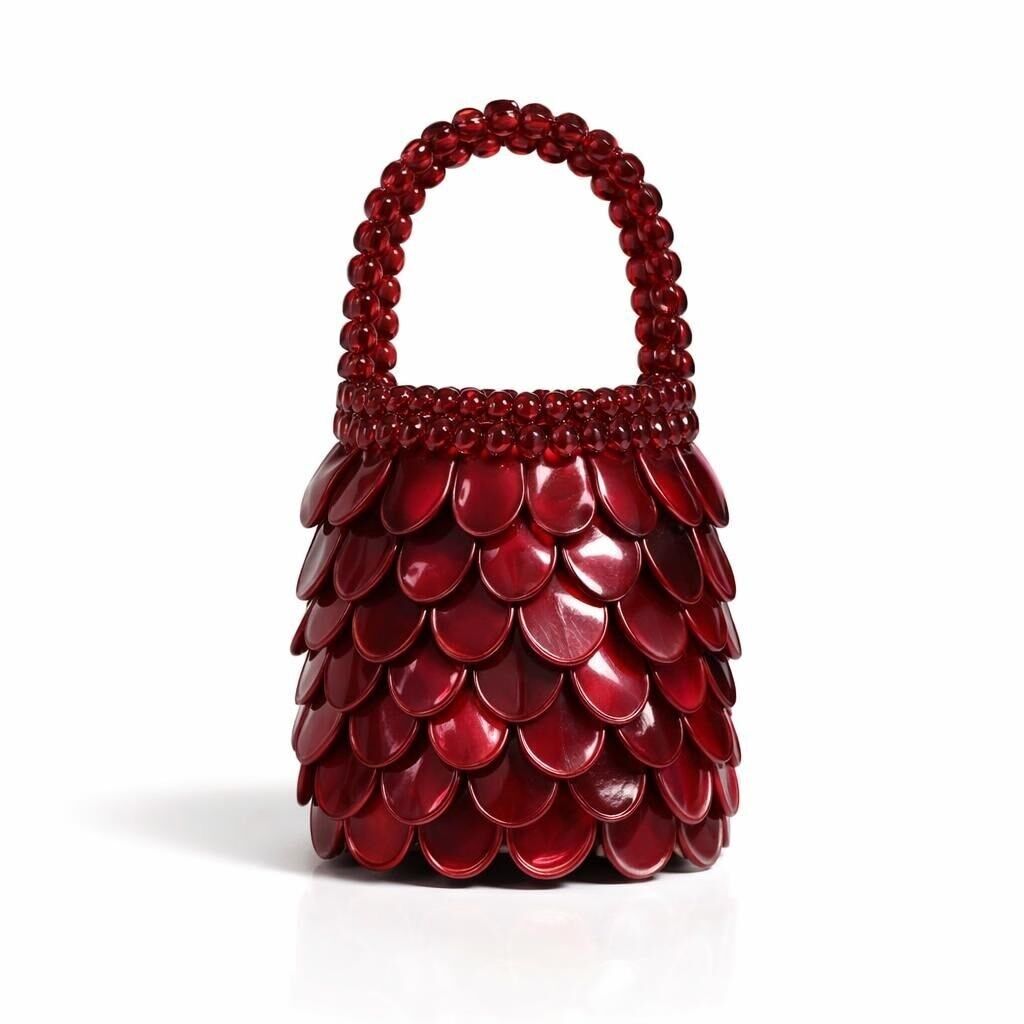 Çantanın dış yüzeyi, damla formunda hassas kesilmiş doğal sedef modüllerin, kontrollü bindirme (overlapping) tekniğiyle üç boyutlu bir kabuk mimarisi oluşturacak şekilde kurgulanmasıyla meydana gelir. Bu ölçekli katmanlama sistemi, yüzeyde ritmik bir akış sağlarken; ışığın farklı açılardan kırılmasını optimize eden yarı-organik bir doku üretir. Her bir sedef plaka, doğal malzemenin lif yönüne paralel biçimde işlenmiş olup, yüzey boyunca homojen bir parlaklık dağılımı elde edilmiştir.