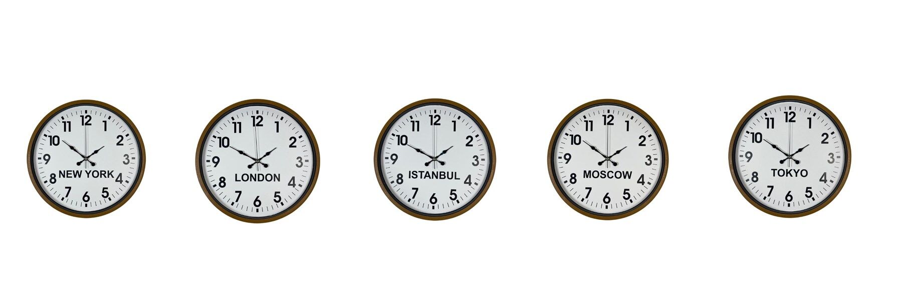 New York, London, Istanbul, Moscow ve Tokyo şehirlerinin saatlerini aynı anda takip etmenizi sağlayan bu özel set; oteller, resepsiyon alanları, ofisler ve uluslararası çalışan firmalar için ideal bir çözümdür.
