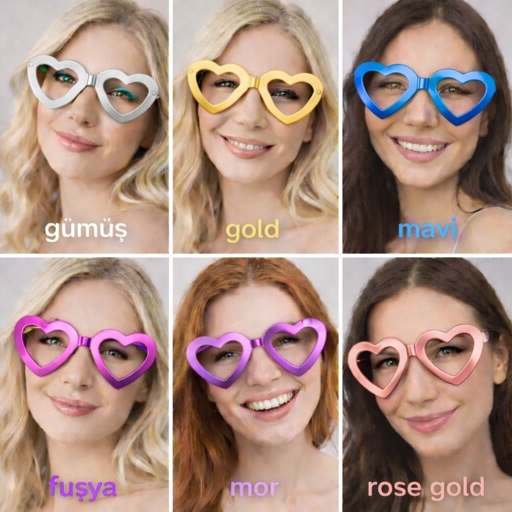 Kalp Şekilli Camsız Parti Gözlüğü, sevgi dolu ve enerjik tasarımıyla tüm organizasyonlarınızı bir festival havasına çeviriyor. Kalp formundaki özel tasarımı ve metalik parlaklıktaki yüzeyiyle stilinize neşe katan bu parti gözlüğü, camsız yapısı sayesinde görüşünüzü etkilemeden gece boyu konforlu bir kullanım sunar. Dayanıklı ve esnek plastik çerçeve yapısı, her yüz tipine uyum sağlarken ultra hafifliği sayesinde yokmuş gibi bir his yaratır. Set içerisinde Gümüş, Mavi, Rose Gold, Fuşya, Mor ve Altın olmak üzere 6 farklı canlı renk seçeneği bulunur. Toplam 12 adetlik paketiyle bekarlığa veda partileri, düğün sonrası eğlenceler (after party), doğum günleri ve festival konseptleri için harika bir grup aksesuarıdır. Fotoğraf çekimlerinde (photobooth) sevdiklerinizle birlikte unutulmaz ve eğlenceli kareler yakalamanızı sağlayacak bu kalp gözlük seti, partinizin en çok konuşulan detaylarından biri olacak.