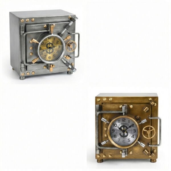 Kasa tasarımlı masaüstü saat, klasik kasa kapaklarından ilham alan detaylı ve özgün görünümüyle dekoratif saat kategorisinde öne çıkan özel bir modeldir. Metal görünümlü gövdesi, vidalı ve kilitli kasa detayları sayesinde endüstriyel ve retro dekorasyon tarzını başarıyla yansıtır. Saatin ön yüzünde yer alan yuvarlak kadran, net rakam yapısı ile kolay okunabilirlik sunarken mekanik kasa hissi veren tasarımı bulunduğu ortamda dikkat çekici bir dekor unsuru oluşturur. 17x20x21 cm ölçüleri sayesinde masa, raf, kitaplık, ofis masası veya vitrin üzerinde dengeli ve güçlü bir duruş sergiler. Sessiz akan mekanizması sayesinde çalışma, dinlenme ve ofis ortamlarında rahatsızlık oluşturmaz. Dayanıklı yapısı uzun süreli kullanım için uygundur. Renk seçeneği bulunmamaktadır; ürün gümüş veya altın tonlu kasa seçeneklerinden karışık olarak gönderilmektedir. Hem fonksiyonel hem de dekoratif bir masa saati arayanlar için şık ve farklı bir alternatiftir.