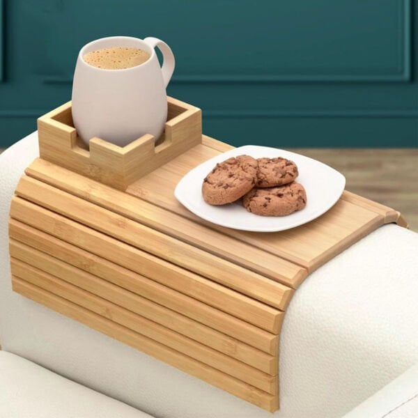 Katlanabilir ahşap koltuk yanı kanepe tepsisi, kol dayama kısmını pratik bir servis alanına dönüştürmek için tasarlanmış kullanışlı bir ev aksesuarıdır. Esnek ve katlanabilir 32x33 cm boyutundaki yapısı sayesinde farklı genişlikteki koltuk ve kanepelere kolayca uyum sağlar. Ahşap yüzeyi içecek, atıştırmalık, kumanda veya telefon gibi eşyaları sabit bir zemin üzerinde kullanmanıza imkân tanır. Üst kısmında yer alan özel bölmeli alan sayesinde kupa veya bardak daha dengeli şekilde konumlandırılabilir. Koltuk yanı tepsi tasarımı ile sehpa ihtiyacını azaltır ve dar alanlarda pratik çözüm sunar. Katlanabilir kanepe tepsisi kullanılmadığında düz şekilde katlanarak kolayca saklanabilir. Doğal ahşap görünümü ile dekorasyona uyum sağlar ve hem oturma odasında hem de çalışma alanlarında işlevsel kullanım sunar. Ahşap koltuk kol dayama tepsisi, evde konforlu ve düzenli bir kullanım deneyimi sağlar.