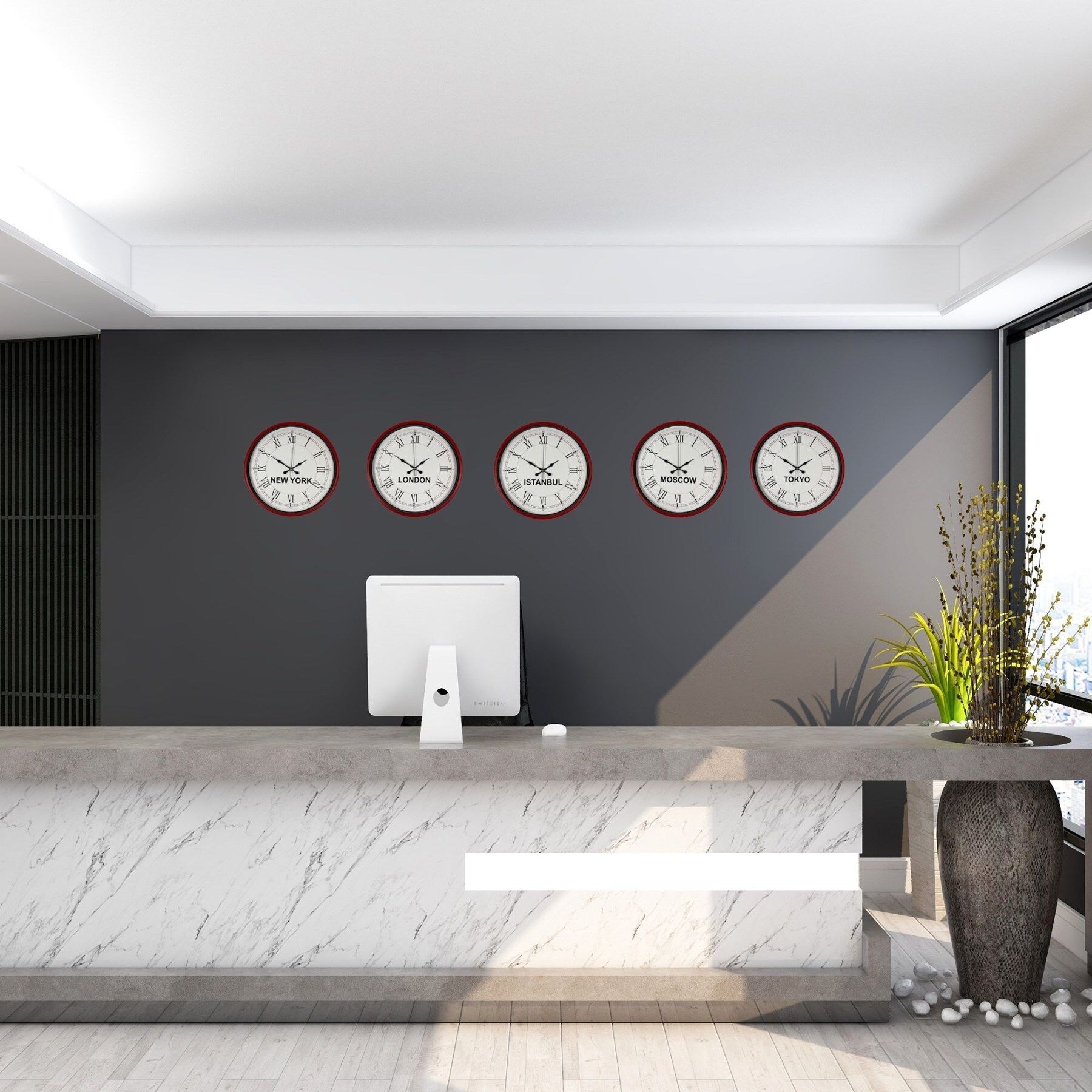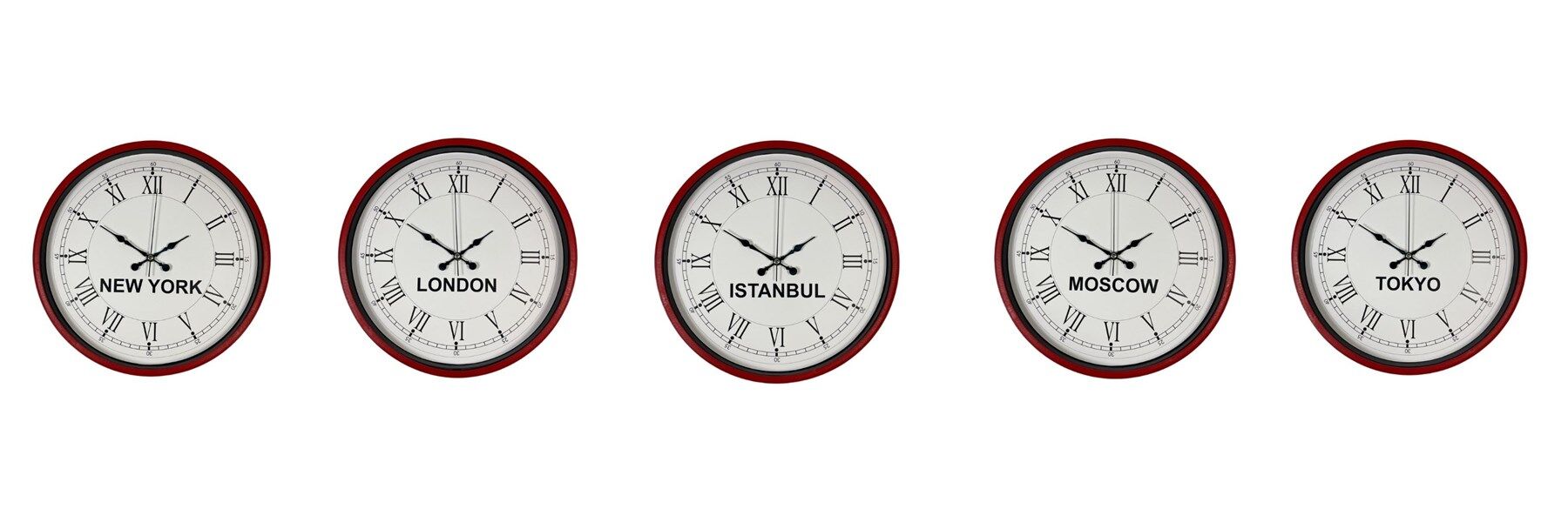 New York, London, Istanbul, Moscow ve Tokyo şehirlerinin saatlerini aynı anda takip etmenizi sağlayan bu özel set; oteller, resepsiyonlar, ofisler ve uluslararası çalışan işletmeler için hem dekoratif hem de profesyonel bir çözümdür.