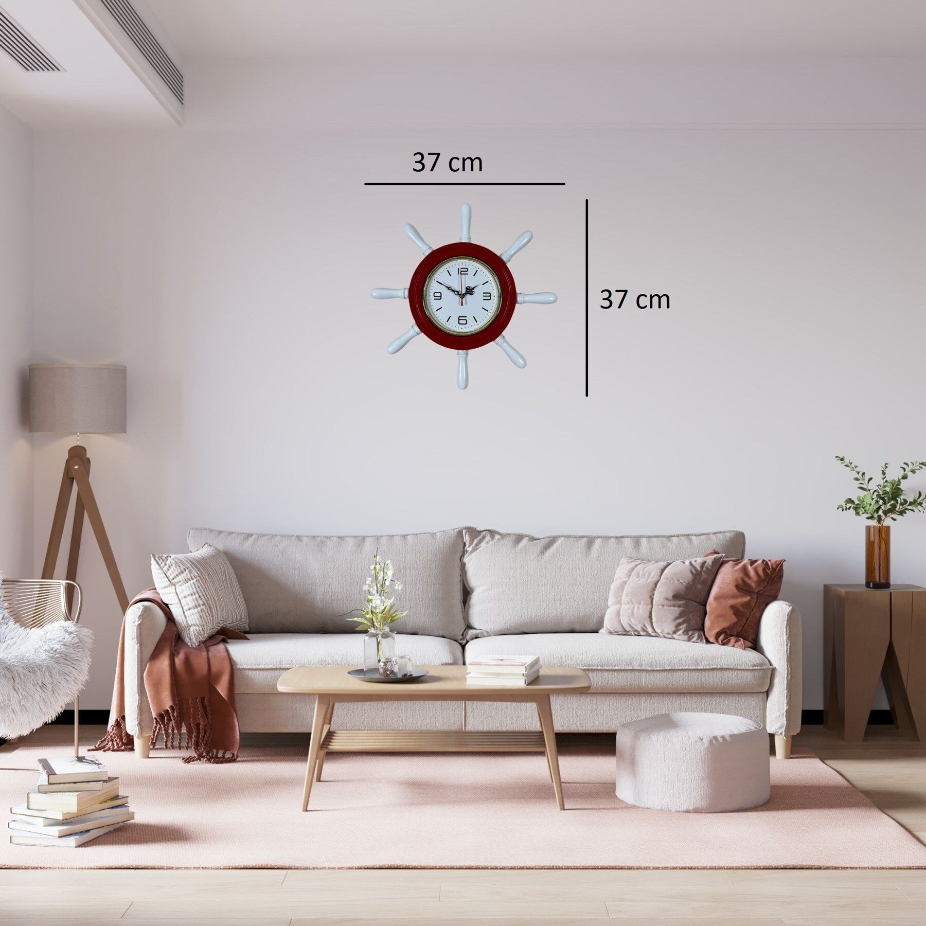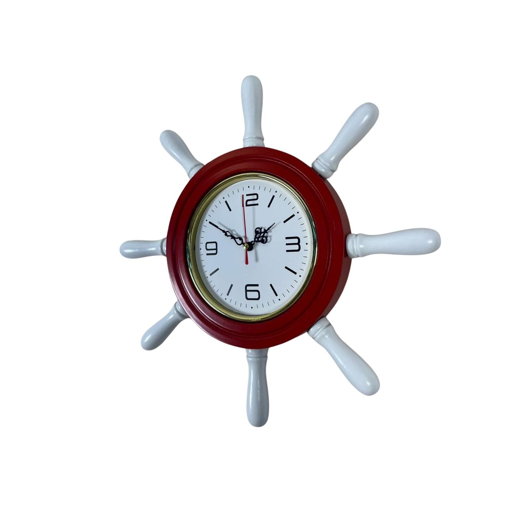 Denizcilik temalı dekorasyonlardan ilham alınarak tasarlanan 37 cm Kırmızı Dümen Duvar Saati, bulunduğu ortama canlı ve dikkat çekici bir marin atmosfer kazandırır. Gemi dümeni formundaki özel tasarımı sayesinde özellikle salon, çocuk odası, genç odası, yazlık ev ve deniz temalı dekorasyonlar için şık ve dekoratif bir duvar saatidir.
