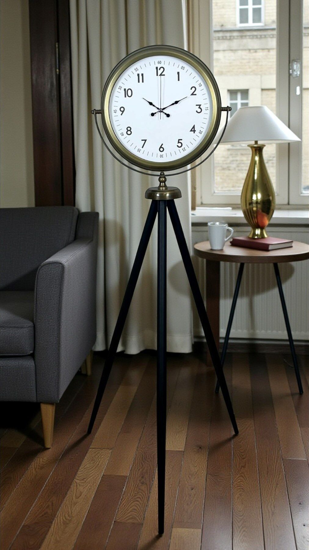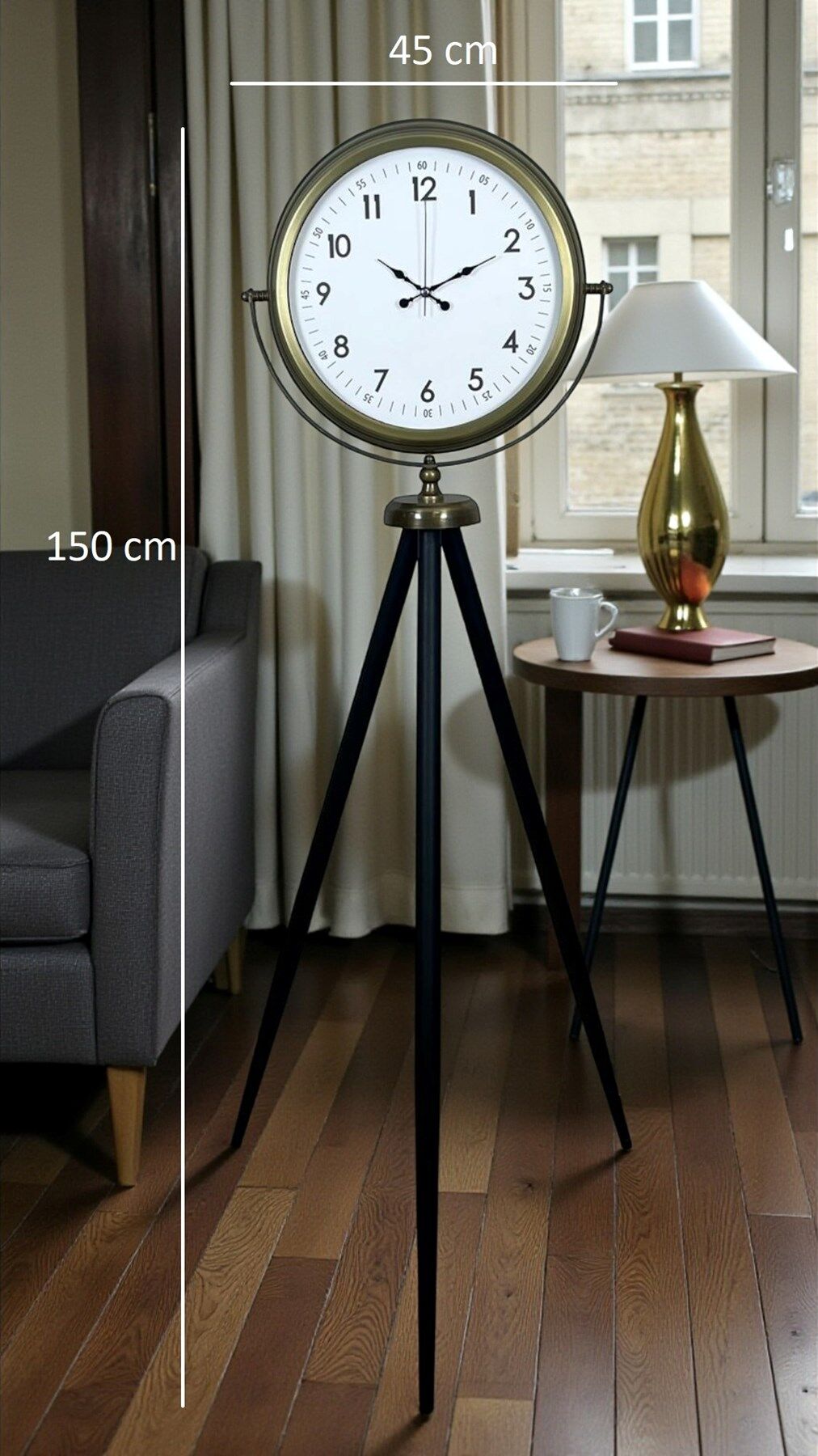 Dekorasyonunda güçlü bir duruş ve zamansız bir şıklık arayanlar için tasarlanan Eskitme Tripod Ayaklı Büyük Boy Saat, 150 cm yüksekliği ve 45 cm genişliğiyle bulunduğu ortamda tek başına fark yaratır. Eskitme metal görünümlü kasası, klasik kadran tasarımı ve siyah tripod ayakları sayesinde hem vintage hem endüstriyel hem de modern dekorasyon stilleriyle mükemmel uyum sağlar.